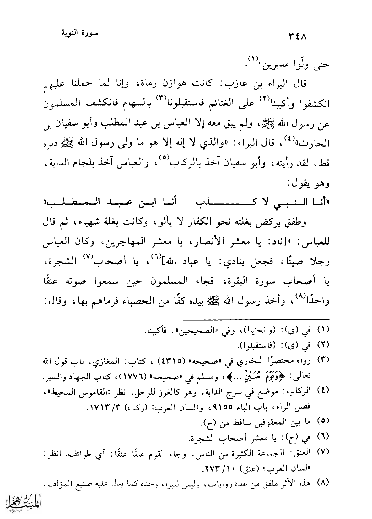 (¬4) رواه مختصرًا البخاري في "صحيحه" (4315)، كتاب: المغازي، باب قول الله تعالى: {وَيَوْمَ حُنَيْنٍ ...}، ومسلم في "صحيحه" (1776)، كتاب الجهاد والسير.