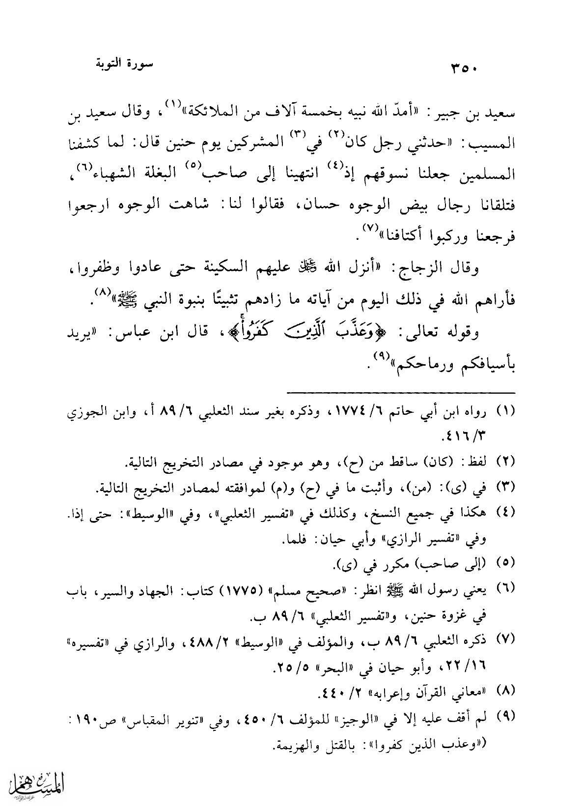 (¬6) يعني رسول الله - صلى الله عليه وسلم - انظر: "صحيح مسلم" (1775) كتاب: الجهاد والسير، باب في غزوة حنين، و"تفسير الثعلبي" 6/ 89 ب.