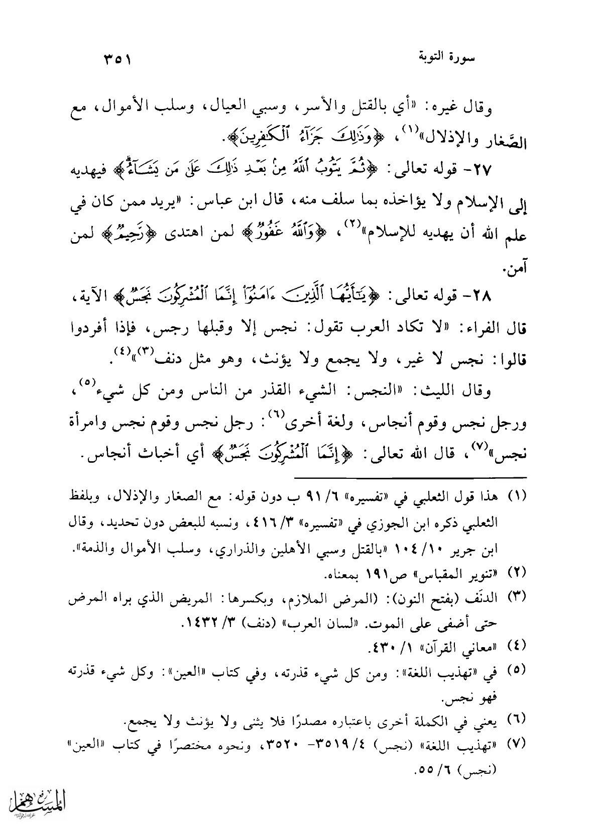 28 - قوله تعالى: {يَا أَيُّهَا الَّذِينَ آمَنُوا إِنَّمَا الْمُشْرِكُونَ نَجَسٌ} الآية، قال الفراء: "لا تكاد العرب تقول: نجس إلا وقبلها رجس، فإذا أفردوا قالوا: نجس لا غير، ولا يجمع ولا يؤنث، وهو مثل دنف (¬3) " (¬4).