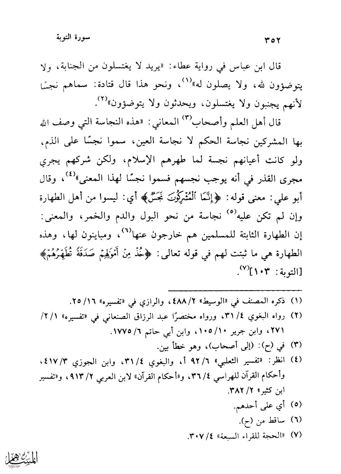 قال أهل العلم وأصحاب (¬3) المعاني: "هذه النجاسة التي وصف الله بها المشركين نجاسة الحكم لا نجاسة العين، سموا نجسًا على الذم، ولو كانت أعيانهم نجسة لما طهرهم الإسلام، ولكن شركهم يجري مجرى القذر في أنه يوجب نجسهم فسموا نجسًا لهذا المعنى" (¬4)، وقال أبو علي: معنى قوله: {إِنَّمَا الْمُشْرِكُونَ نَجَسٌ} أي: ليسوا من أهل الطهارة وإن لم تكن عليه (¬5) نجاسة من نحو البول والدم والخمر، والمعنى: إن الطهارة الثابتة للمسلمين هم خارجون عنها (¬6)، ومباينون لها، وهذه الطهارة هي ما ثبتت لهم في قوله تعالى: {خُذْ مِنْ أَمْوَالِهِمْ صَدَقَةً تُطَهِّرُهُمْ} [التوبة: 103] (¬7).