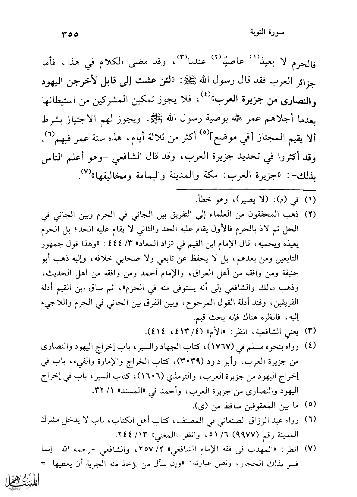 فالحرم لا يعيذ (¬1) عاصيًا (¬2) عندنا (¬3)، وقد مضى الكلام في هذا، فأما جزائر العرب فقد قال رسول الله -صلى الله عليه وسلم- "لئن عشت إلى قابل لأخرجن اليهود والنصارى من جزيرة العرب" (¬4)، فلا يجوز تمكين المشركين من استيطانها بعدما أجلاهم عمر -رضي الله عنه- بوصية رسول الله -صلى الله عليه وسلم-، ويجوز لهم الاجتياز بشرط ألا يقيم المجتاز [في موضع] (¬5) أكثر من ثلاثة أيام، هذه سنة عمر فيهم (¬6). وقد أكثروا في تحديد جزيرة العرب، وقد قال الشافعي -وهو أعلم الناس بذلك-: "جزيرة العرب: مكة والمدينة واليمامة ومخاليفها" (¬7).