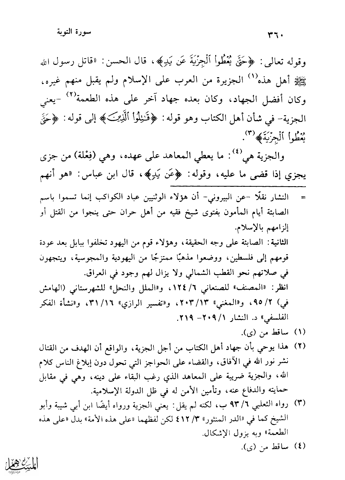 (¬2) هذا يوحي بأن جهاد أهل الكتاب من أجل الجزية، والواقع أن الهدف من القتال نشر نور الله في الآفاق، والقضاء على الحواجز التي تحول دون إبلاغ الناس كلام الله، والجزية ضريبة على المعاهد الذي رغب البقاء على دينه، وهي في مقابل حمايته والدفاع عنه، وتأمين الأمن له في ظل الدولة الإسلامية.