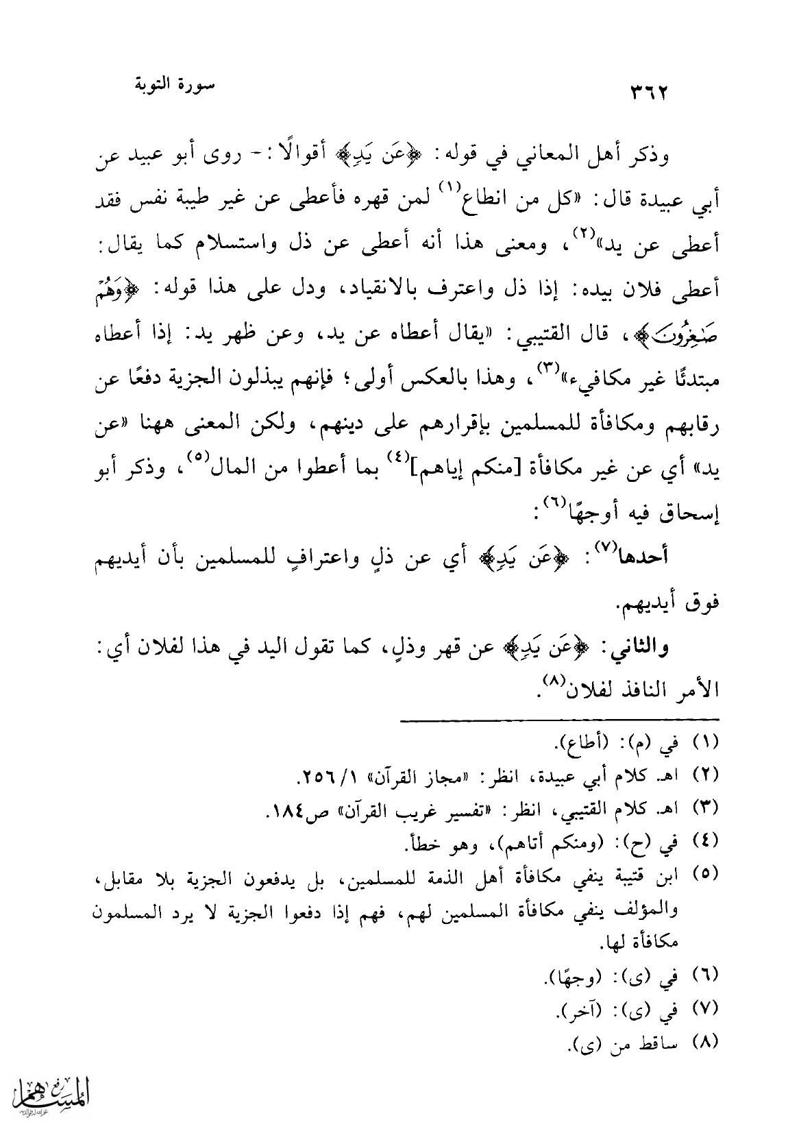 وذكر أهل المعاني في قوله: {عَنْ يَدٍ} أقوالاً:- روى أبو عبيد عن أبي عبيدة قال: "كل من انطاع (¬1) لمن قهره فأعطى عن غير طيبة نفس فقد أعطى عن يد" (¬2)، ومعنى هذا أنه أعطى عن ذل واستسلام كما يقال: أعطى فلان بيده: إذا ذل واعترف بالانقياد، ودل على هذا قوله: {وَهُمْ صَاغِرُونَ}، قال القتيبي: "يقال أعطاه عن يد، وعن ظهر يد: إذا أعطاه مبتدئًا غير مكافيء" (¬3)، وهذا بالعكس أولى؛ فإنهم يبذلون الجزية دفعًا عن رقابهم ومكافأة للمسلمين بإقرارهم على دينهم، ولكن المعنى ههنا "عن يد" أي عن غير مكافأة [منكم إياهم] (¬4) بما أعطوا من المال (¬5)، وذكر أبو إسحاق فيه أوجهًا (¬6):