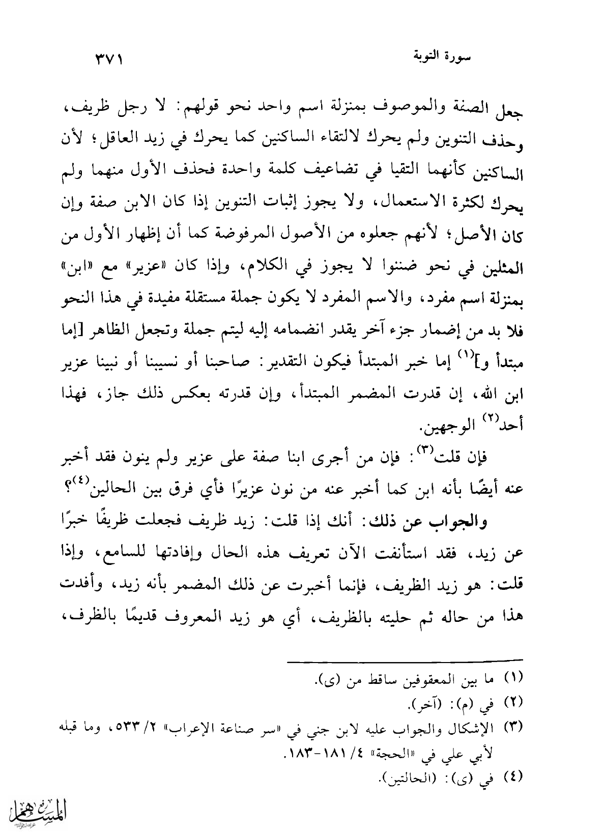 جعل الصفة والموصوف بمنزلة اسم واحد نحو قولهم: لا رجل ظريف، وحذف التنوين ولم يحرك لالتقاء الساكنين كما يحرك في زيد العاقل؛ لأن الساكنين كأنهما التقيا في تضاعيف كلمة واحدة فحذف الأول منهما ولم يحرك لكثرة الاستعمال، ولا يجوز إثبات التنوين إذا كان الابن صفة وإن كان الأصل؛ لأنهم جعلوه من الأصول المرفوضة كما أن إظهار الأول من المثلين في نحو ضننوا لا يجوز في الكلام، وإذا كان "عزير" مع "ابن" بمنزلة اسم مفرد، والاسم المفرد لا يكون جملة مستقلة مفيدة في هذا النحو فلا بد من إضمار جزء آخر يقدر انضمامه إليه ليتم جملة وتجعل الظاهر [إما مبتدأ و] (¬1) إما خبر المبتدأ فيكون التقدير: صاحبنا أو نسيبنا أو نبينا عزير ابن الله، إن قدرت المضمر المبتدأ، وإن قدرته بعكس ذلك جاز، فهذا أحد (¬2) الوجهين.