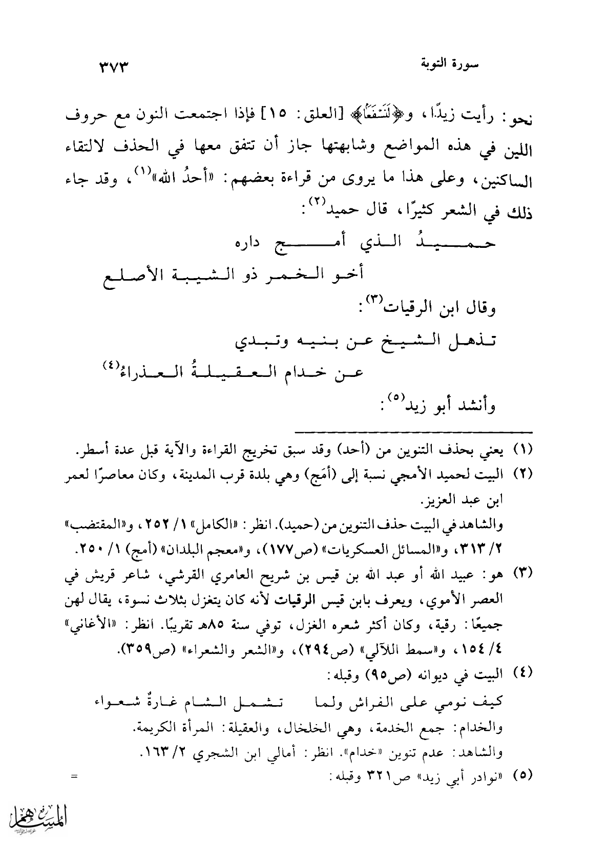 نحو: رأيت زيدًا، و {لَنَسْفَعًا} [العلق: 15] فإذا اجتمعت النون مع حروف اللين في هذه المواضع وشابهتها جاز أن تتفق معها في الحذف لالتقاء الساكنين، وعلى هذا ما يروى من قراءة بعضهم: "أحدُ الله" (¬1)، وقد جاء ذلك في الشعر كثيراً، قال حميد (¬2):