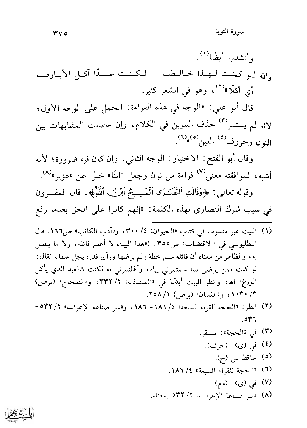 (¬8) "سر صناعة الإعراب" 2/ 532 بمعناه.