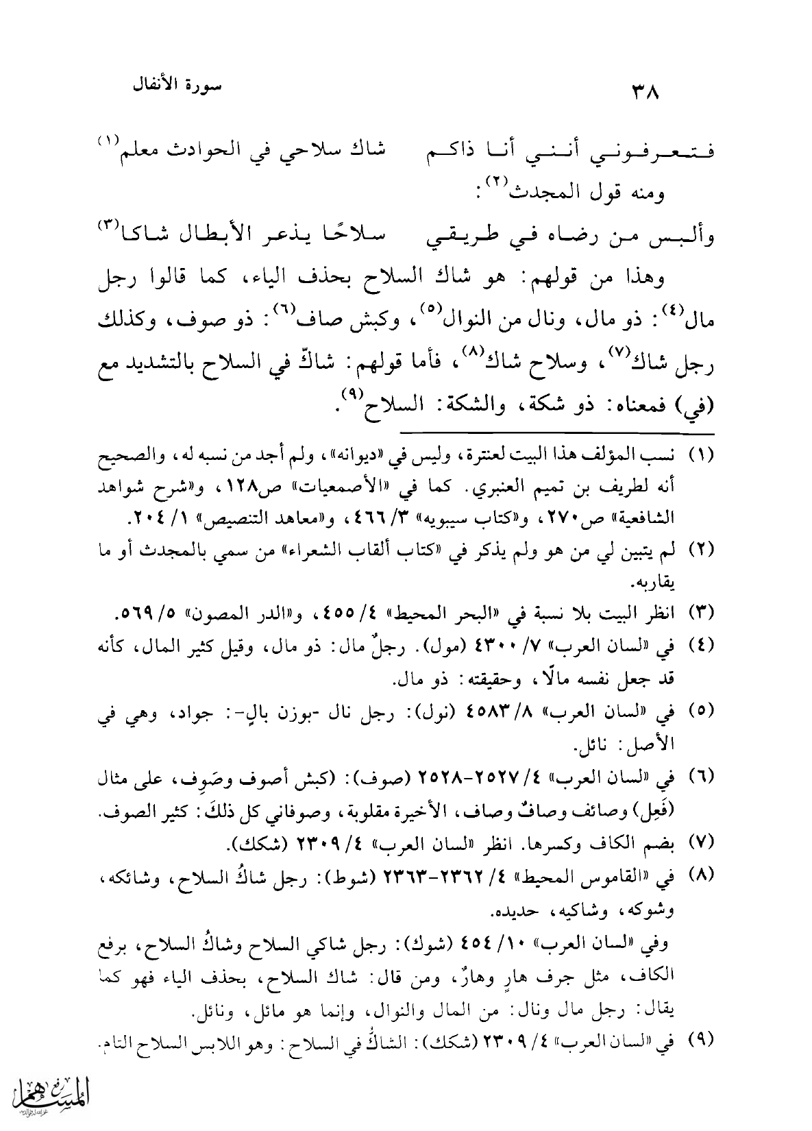 وهذا من قولهم: هو شاك السلاح بحذف الياء، كما قالوا رجل مال (¬4): ذو مال، ونال من النوال (¬5)، وكبش صاف (¬6): ذو صوف، وكذلك رجل شاك (¬7)، وسلاح شاك (¬8)، فأما قولهم: شاكّ في السلاح بالتشديد مع (في) فمعناه: ذو شكة، والشكة: السلاح (¬9).