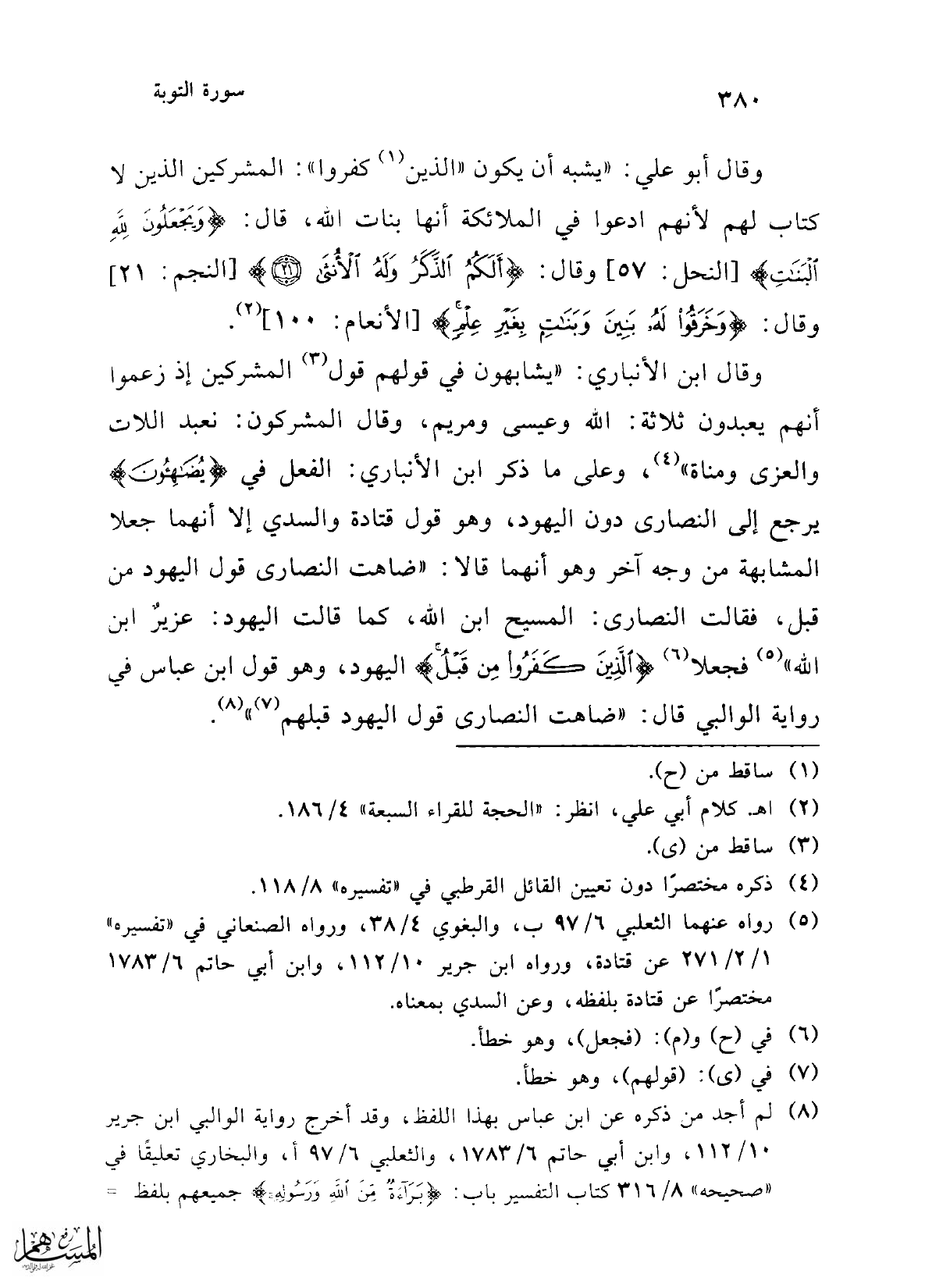 وقال أبو علي: "يشبه أن يكون "الذين (¬1) كفروا": المشركين الذين لا كتاب لهم لأنهم ادعوا في الملائكة أنها بنات الله، قال: {وَيَجْعَلُونَ لِلَّهِ الْبَنَاتِ} [النحل: 57] وقال: {أَلَكُمُ الذَّكَرُ وَلَهُ الْأُنْثَى (21)} [النجم: 21] وقال: {وَخَرَقُوا لَهُ بَنِينَ وَبَنَاتٍ بِغَيْرِ عِلْمٍ} [الأنعام: 100] (¬2).