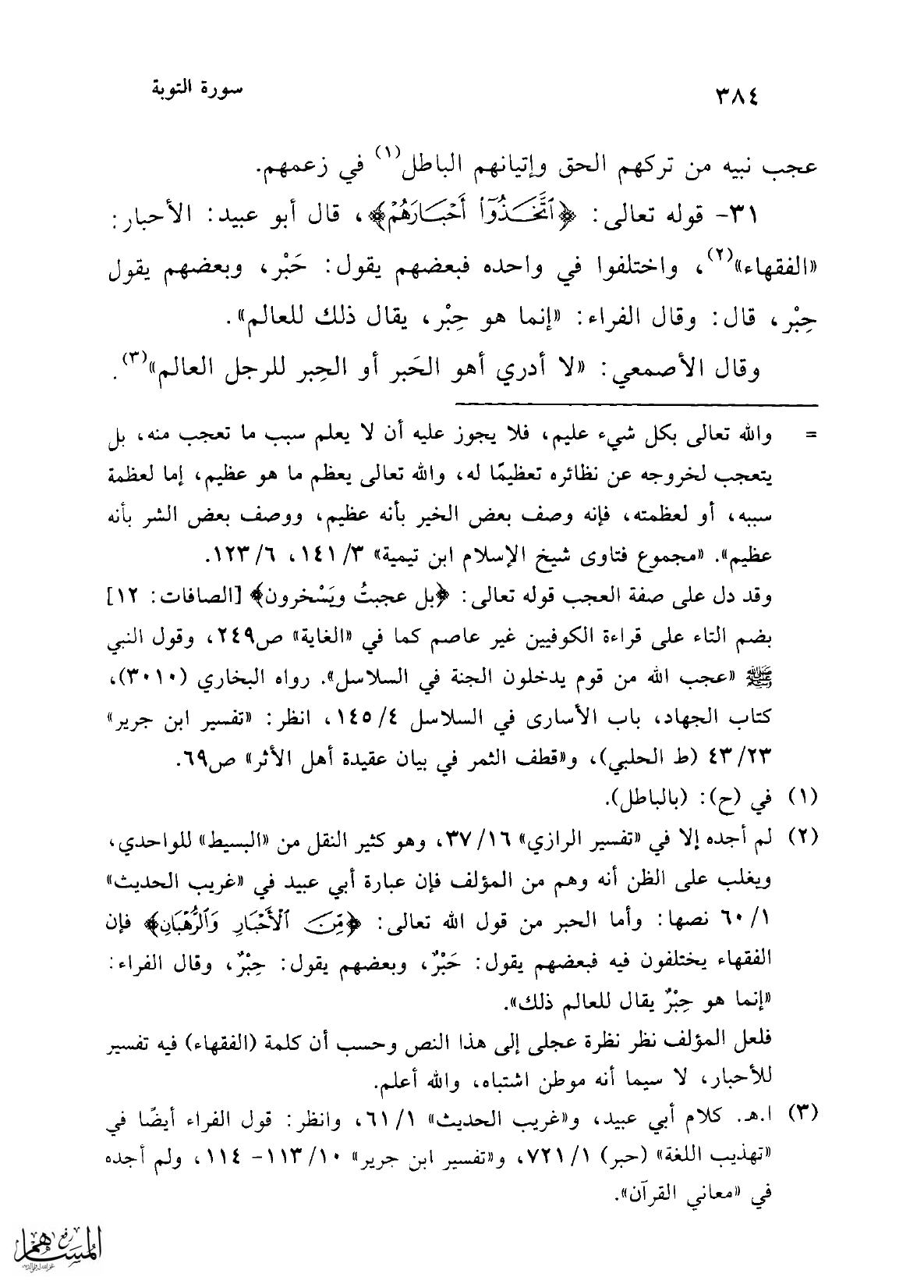 31 - قوله تعالى: {اتَّخَذُوا أَحْبَارَهُمْ}، قال أبو عبيد: الأحبار: "الفقهاء" (¬2)، واختلفوا في واحده فبعضهم يقول: حَبْر، وبعضهم يقول حِبْر، قال: وقال الفراء: "إنما هو حِبْر، يقال ذلك للعالم".