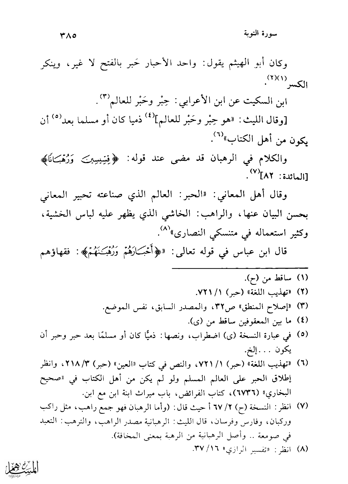 (¬6) "تهذيب اللغة" (حبر) 1/ 721، والنص في كتاب "العين" (حبر) 3/ 218، وانظر إطلاق الحبر على العالم المسلم ولو لم يكن من أهل الكتاب في "صحيح البخاري" (6736)، كتاب الفرائض، باب ميراث ابنة ابن مع ابن.