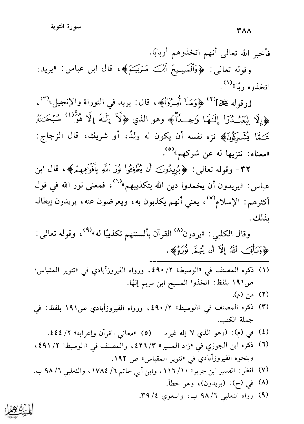 32 - وقوله تعالى: {يُرِيدُونَ أَنْ يُطْفِئُوا نُورَ اللَّهِ بِأَفْوَاهِهِمْ}، قال ابن عباس: "يريدون أن يخمدوا دين الله بتكذيبهم" (¬6)، فمعنى نور الله في قول أكثرهم: الإسلام (¬7)، يعني أنهم يكذبون به، ولعرضون عنه، يريدون إبطاله بذلك.