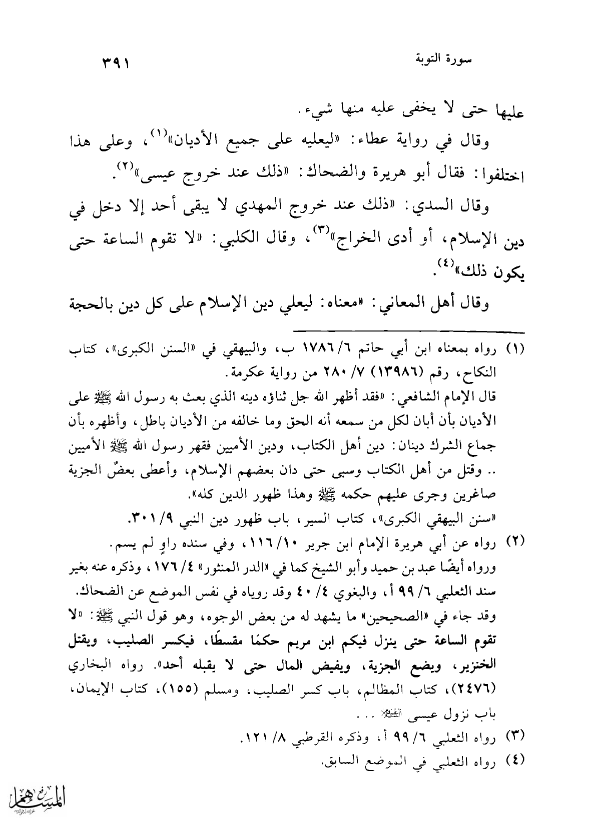 وقال في رواية عطاء: "ليعليه على جميع الأديان" (¬1)، وعلى هذا اختلفوا: فقال أبو هريرة والضحاك: "ذلك عند خروج عيسى" (¬2).