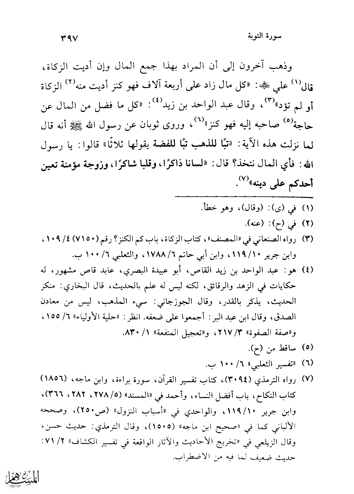 (¬7) رواه الترمذي (3094)، كتاب تفسير القرآن، سورة براءة، وابن ماجه، (1856) كتاب النكاح، باب أفضل النساء، وأحمد في "المسند" (5/ 278، 282، 366)، وابن جرير 10/ 119، والواحدي في "أسباب النزول" (ص 250)، وصححه الألباني كما في "صحيح ابن ماجه" (1505)، وقال الترمذي: حديث حسن، وقال الزيلعي في "تخريج الأحاديث والآثار الواقعة في تفسير الكشاف" 2/ 71: حديث ضعيف لما فيه من الاضطراب.