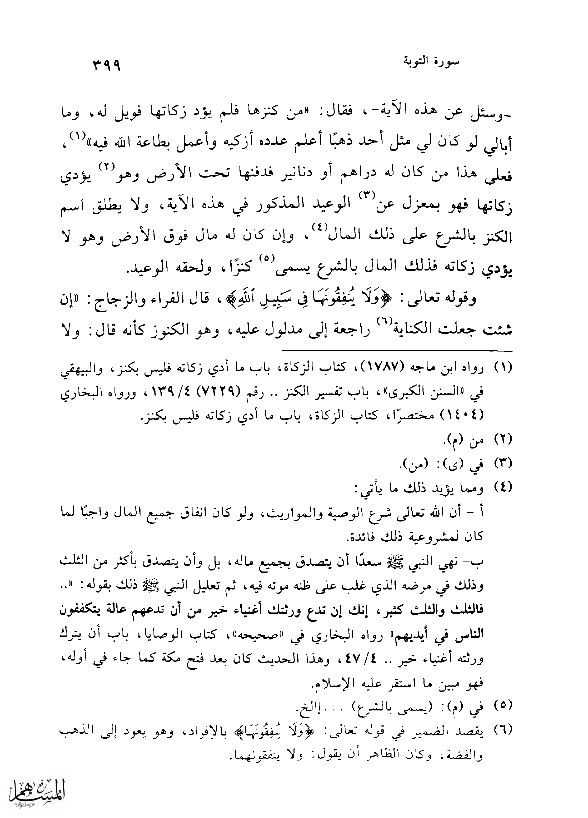 (¬6) يقصد الضمير في قوله تعالى: {وَلَا يُنْفِقُونَهَا} بالإفراد، وهو يعود إلى الذهب والفضة، وكان الظاهر أن يقول: ولا ينفقونهما.