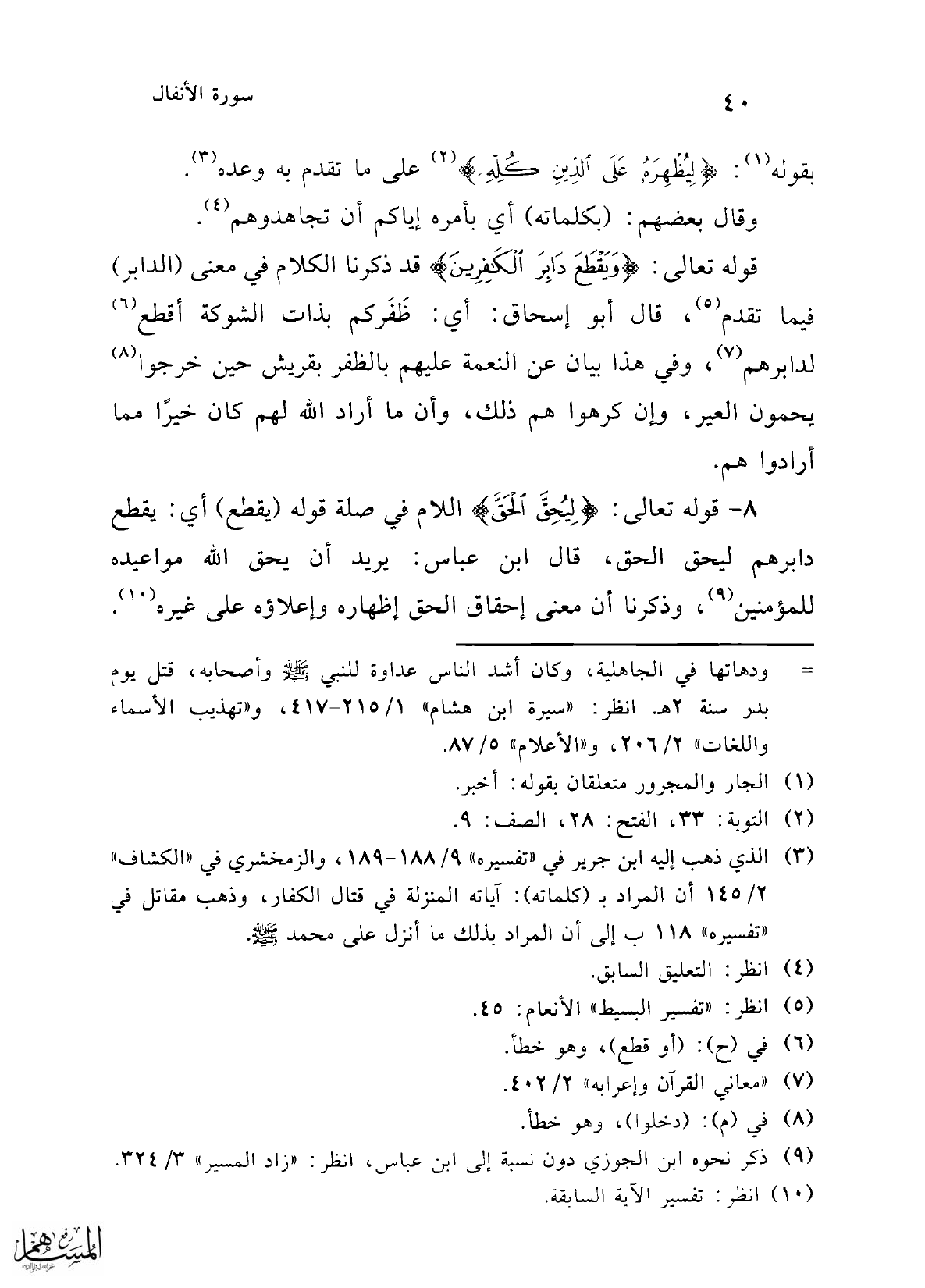 (¬3) الذي ذهب إليه ابن جرير في "تفسيره" 9/ 188 - 189، والزمخشري في "الكشاف" 2/ 145 أن المراد بـ (كلماته): آياته المنزلة في قتال الكفار، وذهب مقاتل في "تفسيره" 118 ب إلى أن المراد بذلك ما أنزل على محمد - صلى الله عليه وسلم -.