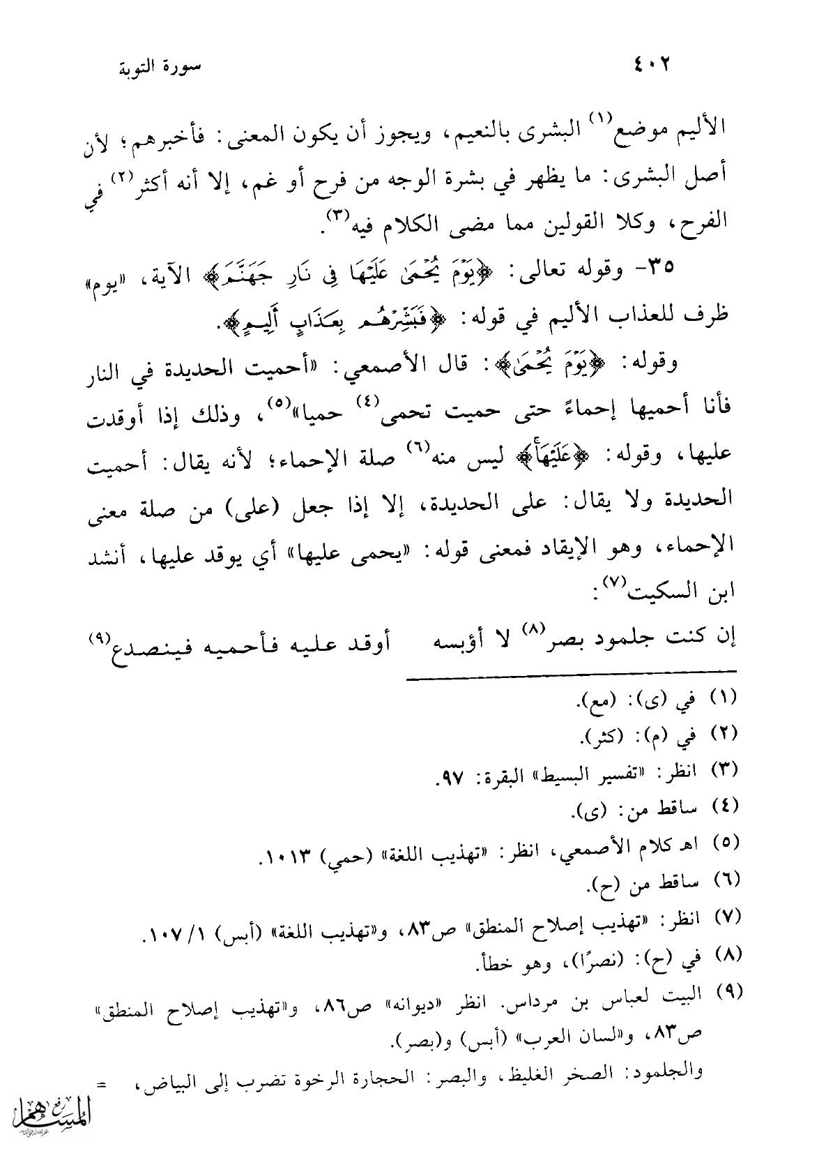 وقوله: {يَوْمَ يُحْمَى}: قال الأصمعي: "أحميت الحديدة في النار فأنا أحميها إحماءً حتى حميت تحمى (¬4) حميا" (¬5)، وذلك إذا أوقدت عليها، وقوله: {عَلَيْهَا} ليس منه (¬6) صلة الإحماء؛ لأنه يقال: أحميت الحديدة ولا يقال: على الحديدة، إلا إذا جعل (على) من صلة معنى الإحماء، وهو الإيقاد فمعنى قوله: "يحمى عليها" أي يوقد عليها، أنشد ابن السكيت (¬7):
