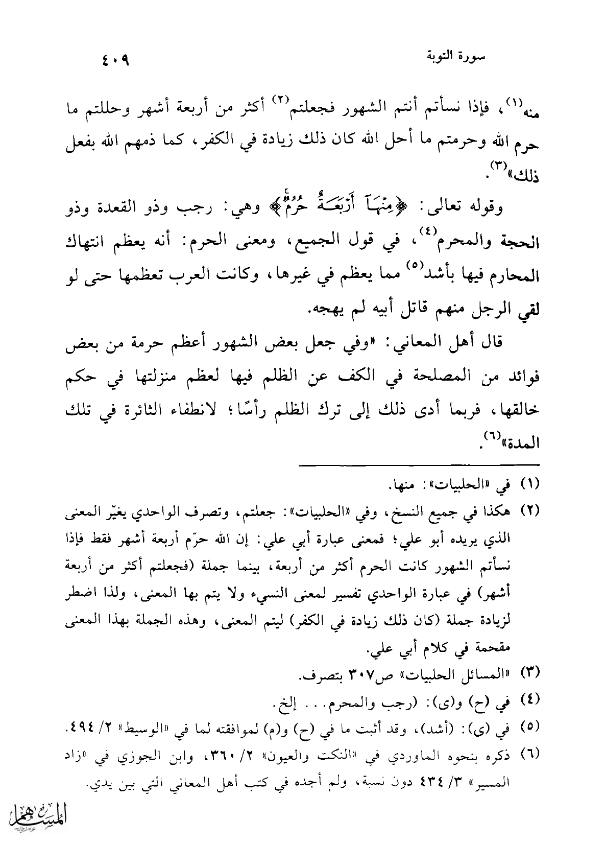 (¬2) هكذا في جميع النسخ، وفي "الحلبيات": جعلتم، وتصرف الواحدي يغيّر المعنى الذي يريده أبو علي؛ فمعنى عبارة أبي علي: إن الله حرّم أربعة أشهر فقط فإذا نسأتم المشهور كانت الحرم أكثر من أربعة، بينما جملة (فجعلتم أكثر من أربعة أشهر) في عبارة الواحدي تفسير لمعنى النسيء ولا يتم بها المعنى، ولذا اضطر لزيادة جملة (كان ذلك زيادة في الكفر) ليتم المعنى، وهذه الجملة بهذا المعنى مقحمة في كلام أبي علي.