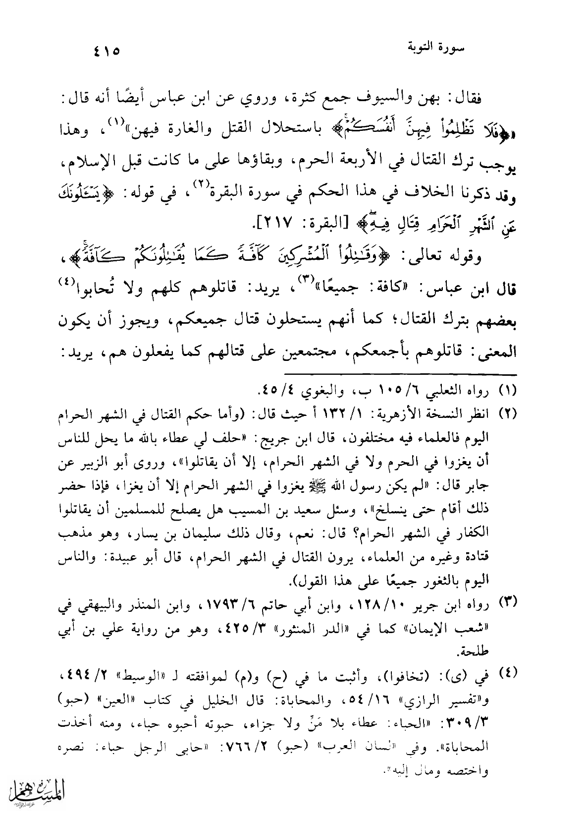 فقال: بهن والسيوف جمع كثرة، وروي عن ابن عباس أيضًا أنه قال: " {فَلَا تَظْلِمُوا فِيهِنَّ أَنْفُسَكُمْ} باستحلال القتل والغارة فيهن" (¬1)، وهذا يوجب ترك القتال في الأربعة الحرم، وبقاؤها على ما كانت قبل الإسلام، وقد ذكرنا الخلاف في هذا الحكم في سورة البقرة (¬2)، في قوله: {يَسْأَلُونَكَ عَنِ الشَّهْرِ الْحَرَامِ قِتَالٍ فِيهِ} [البقرة: 217].