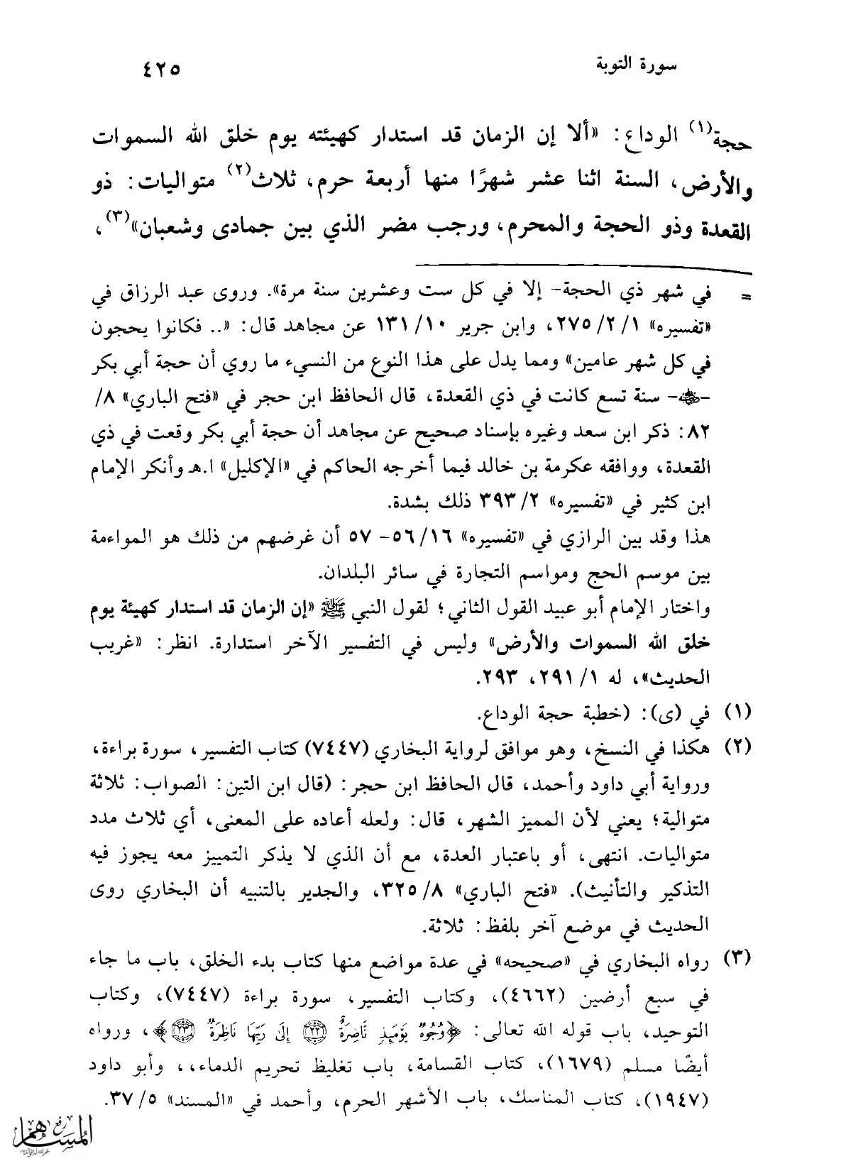 حجة (¬1) الوداع: "ألا إن الزمان قد استدار كهيئته يوم خلق الله السموات والأرض، السنة اثنا عشر شهرًا منها أربعة حرم، ثلاث (¬2) متواليات: ذو القعدة وذو الحجة والمحرم، ورجب مضر الذي بين جمادى وشعبان" (¬3)،