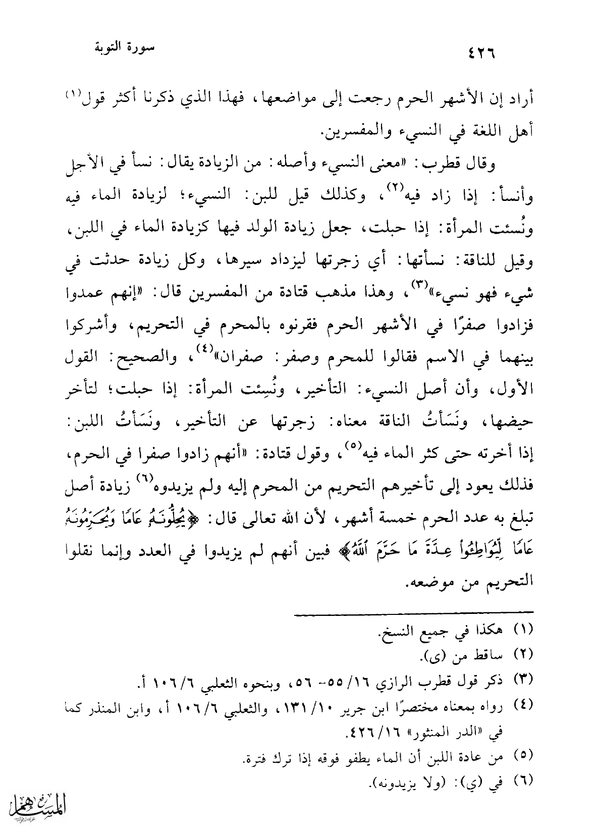 وقال قطرب: "معنى النسيء وأصله: من الزيادة يقال: نسأ في الأجل وأنسأ: إذا زاد فيه (¬2)، وكذلك قيل للبن: النسيء؛ لزيادة الماء فيه ونُسئت المرأة: إذا حبلت، جعل زيادة الولد فيها كزيادة الماء في اللبن، وقيل للناقة: نسأتها: أي زجرتها ليزداد سيرها، وكل زيادة حدثت في شيء فهو نسيء" (¬3)، وهذا مذهب قتادة من المفسرين قال: "إنهم عمدوا فزادوا صفرًا في الأشهر الحرم فقرنوه بالمحرم في التحريم، وأشركوا بينهما في الاسم فقالوا للمحرم وصفر: صفران" (¬4)، والصحيح: القول الأول، وأن أصل النسيء: التأخير، ونُسِئت المرأة: إذا حبلت؛ لتأخر حيضها، ونَسَأتُ الناقة معناه: زجرتها عن التأخير، ونَسَأتُ اللبن: إذا أخرته حتى كثر الماء فيه (¬5)، وقول قتادة: "أنهم زادوا صفرا في الحرم، فذلك يعود إلى تأخيرهم التحريم من المحرم إليه ولم يزيدوه (¬6) زيادة أصل تبلغ به عدد الحرم خمسة أشهر؛ لأن الله تعالى قال: {يُحِلُّونَهُ عَامًا وَيُحَرِّمُونَهُ عَامًا لِيُوَاطِئُوا عِدَّةَ مَا حَرَّمَ اللَّهُ} فبين أنهم لم يزيدوا في العدد وإنما نقلوا التحريم من موضعه.