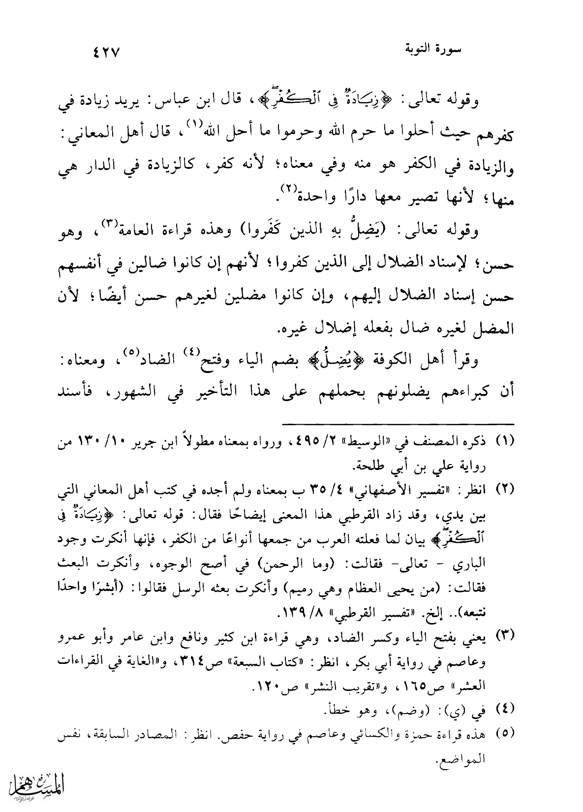 وقوله تعالى: {زِيَادَةٌ فِي الْكُفْرِ}، قال ابن عباس: يريد زيادة في كفرهم حيث أحلوا ما حرم الله وحرموا ما أحل الله (¬1)، قال أهل المعاني: والزيادة في الكفر هو منه وفي معناه؛ لأنه كفر، كالزيادة في الدار هي منها؛ لأنها تصير معها دارًا واحدة (¬2).