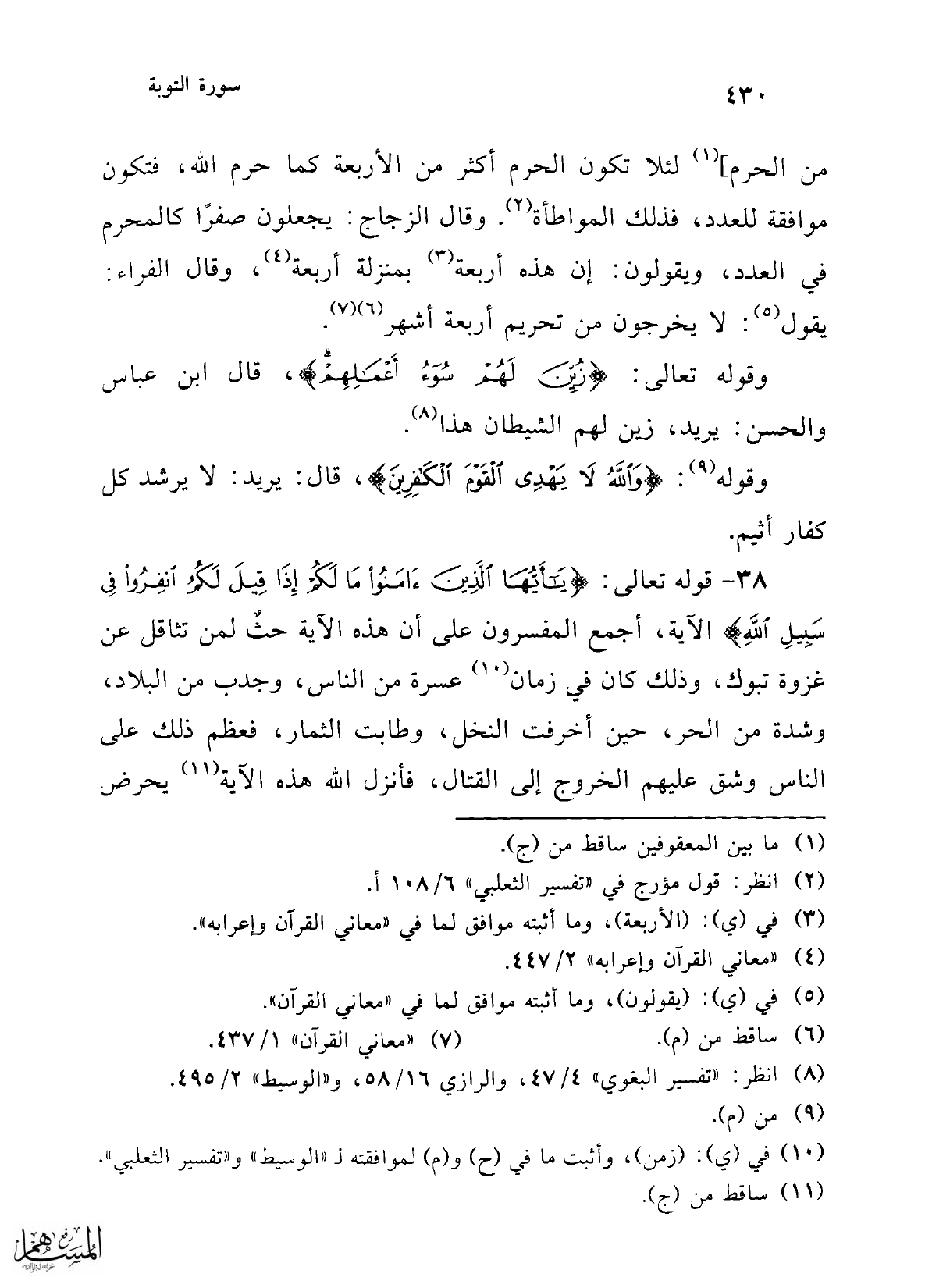 من الحرم] (¬1) لئلا تكون الحرم أكثر من الأربعة كما حرم الله، فتكون موافقة للعدد، فذلك المواطأة (¬2). وقال الزجاج: يجعلون صفرًا كالمحرم في العدد، ويقولون: إن هذه أربعة (¬3) بمنزلة أربعة (¬4)، وقال الفراء: يقول (¬5): لا يخرجون من تحريم أربعة أشهر (¬6) (¬7).