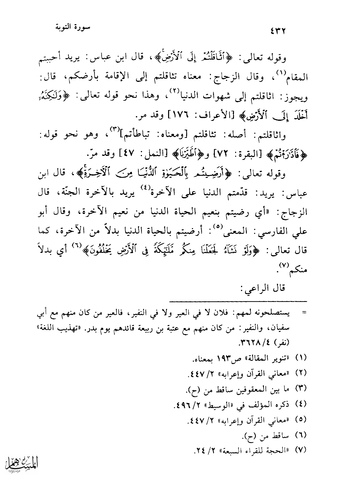 وقوله تعالى: {اثَّاقَلْتُمْ إِلَى الْأَرْضِ}، قال ابن عباس: يريد أحببتم المقام (¬1)، وقال الزجاج: معناه تثاقلتم إلى الإقامة بأرضكم، قال: ويجوز: اثاقلتم إلى شهوات الدنيا (¬2)، وهذا نحو قوله تعالى: {وَلَكِنَّهُ أَخْلَدَ إِلَى الْأَرْضِ} [الأعراف: 176] وقد مر.