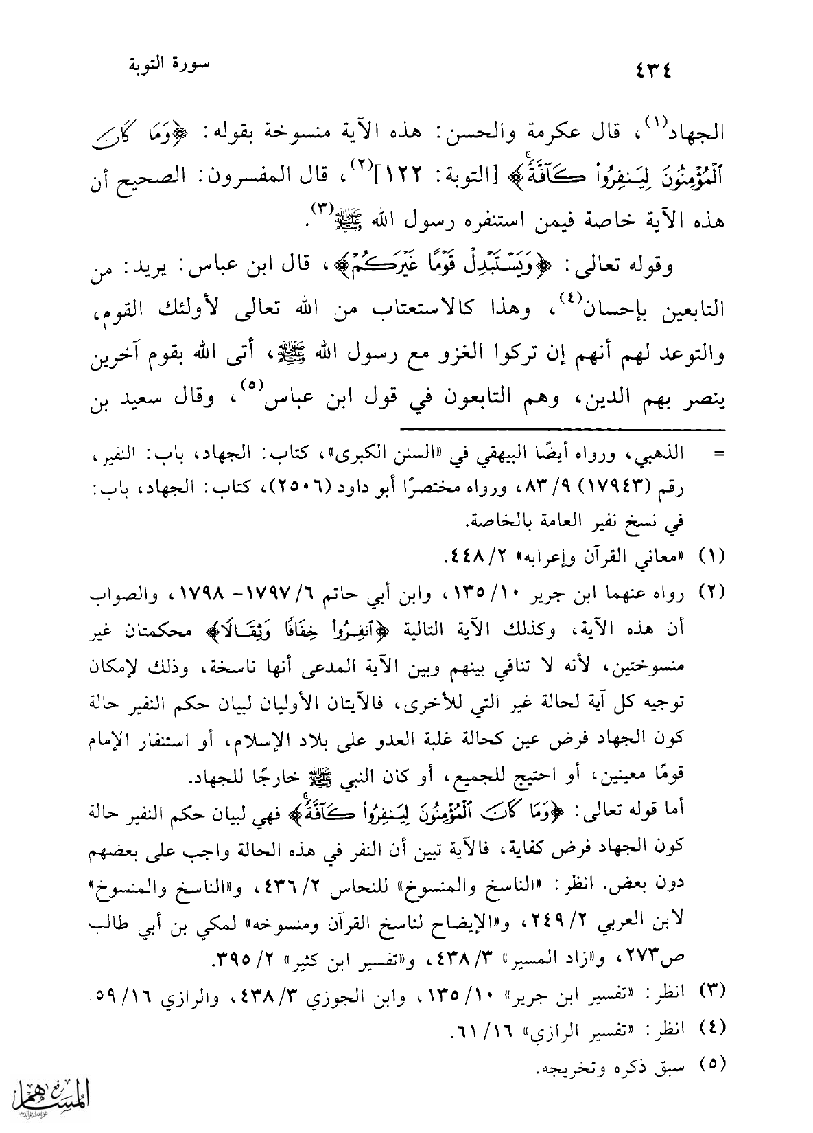 أما قوله تعالى: {وَمَا كَانَ الْمُؤْمِنُونَ لِيَنْفِرُوا كَافَّةً} فهي لبيان حكم النفير حالة كون الجهاد فرض كفاية، فالآية تبين أن النفر في هذه الحالة واجب على بعضهم دون بعض. انظر: "الناسخ والمنسوخ" للنحاس 2/ 436، و"الناسخ والمنسوخ" لابن العربي 2/ 249، و"الإيضاح لناسخ القرآن ومنسوخه" لمكي بن أبي طالب ص 273، و"زاد المسير" 3/ 438، و"تفسير ابن كثير" 2/ 395.