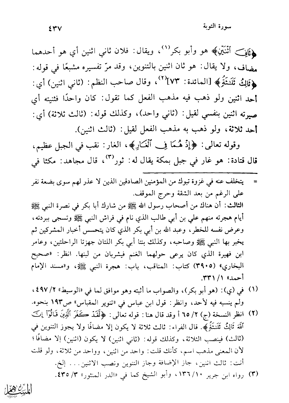 {ثَانِيَ اثْنَيْنِ} هو وأبو بكر (¬1)، ويقال: فلان ثاني اثنين أي هو أحدهما مضاف، ولا يقال: هو ثان اثنين بالتنوين، وقد مرّ تفسيره مشبعًا في قوله: {ثَالِثُ ثَلَاثَةٍ} [المائدة: 73] (¬2)، وقال صاحب النظم: (ثاني اثنين) أي: أحد اثنين ولو ذهب فيه مذهب الفعل كما تقول: كان واحداً فثنيته أي صيرته اثنين بنفسي لقيل: (ثاني واحد)، وكذلك قوله: (ثالث ثلاثة) أي: أحد ثلاثة، ولو ذهب به مذهب الفعل لقيل: (ثالث اثنين).