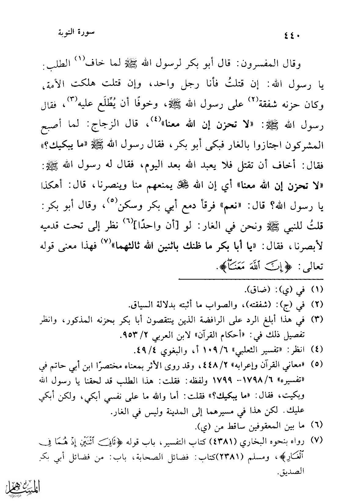 (¬7) رواه بنحوه البخاري (4381) كتاب التفسير، باب قوله {ثَانِيَ اثْنَيْنِ إِذْ هُمَا فِي الْغَارِ}، ومسلم (2381) كتاب: فضائل الصحابة، باب: من فضائل أبي بكر الصديق.