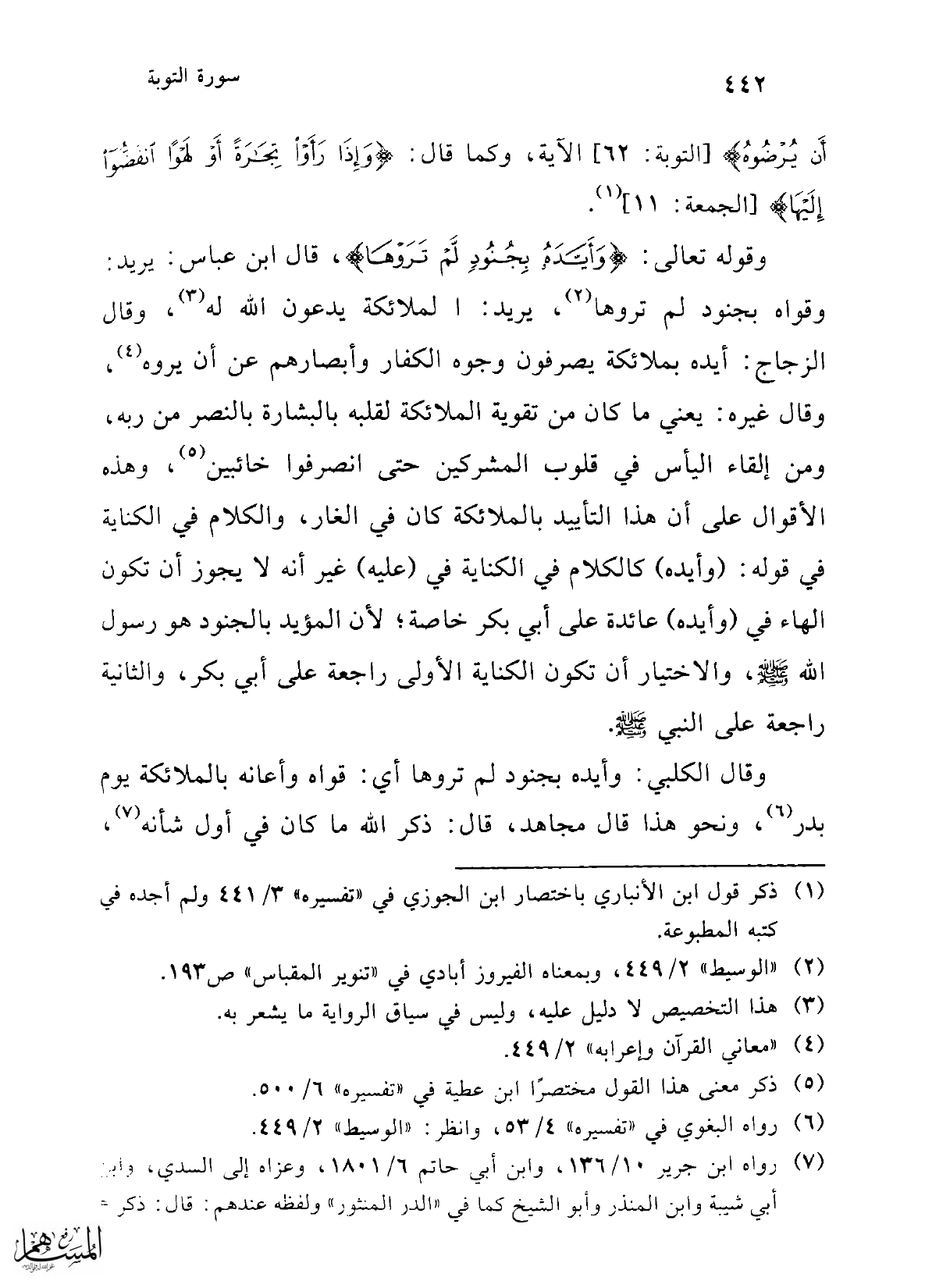 وقوله تعالى: {وَأَيَّدَهُ بِجُنُودٍ لَمْ تَرَوْهَا}، قال ابن عباس: يريد: وقواه بجنود لم تروها (¬2)، يريد: الملائكة يدعون الله له (¬3)، وقال الزجاج: أيده بملائكة يصرفون وجوه الكفار وأبصارهم عن أن يروه (¬4)، وقال غيره: يعني ما كان من تقوية الملائكة لقلبه بالبشارة بالنصر من ربه، ومن إلقاء اليأس في قلوب المشركين حتى انصرفوا خائبين (¬5)، وهذه الأقوال على أن هذا التأييد بالملائكة كان في الغار، والكلام في الكناية في قوله: (وأيده) كالكلام في الكناية في (عليه) غير أنه لا يجوز أن تكون الهاء في (وأيده) عائدة على أبي بكر خاصة؛ لأن المؤيد بالجنود هو رسول الله - صلى الله عليه وسلم -، والاختيار أن تكون الكناية الأولى راجعة على أبي بكر، والثانية راجعة على النبي -صلى الله عليه وسلم-.