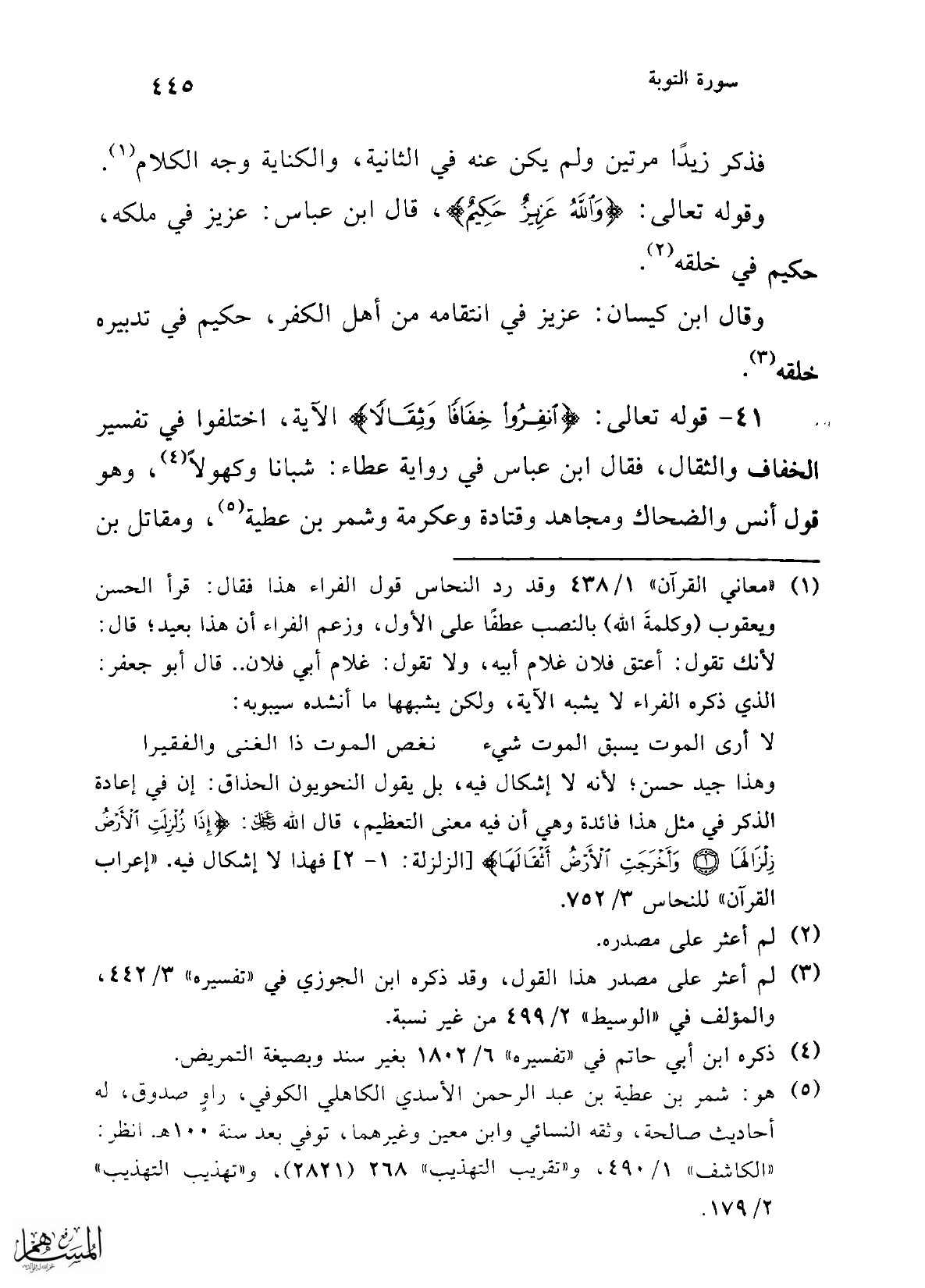 41 - قوله تعالى: {انْفِرُوا خِفَافًا وَثِقَالًا} الآية، اختلفوا في تفسير الخفاف والثقال، فقال ابن عباس في رواية عطاء: شبانا وكهولاً (¬4)، وهو قول أنس والضحاك ومجاهد وقتادة وعكرمة وشمر بن عطية (¬5)، ومقاتل بن