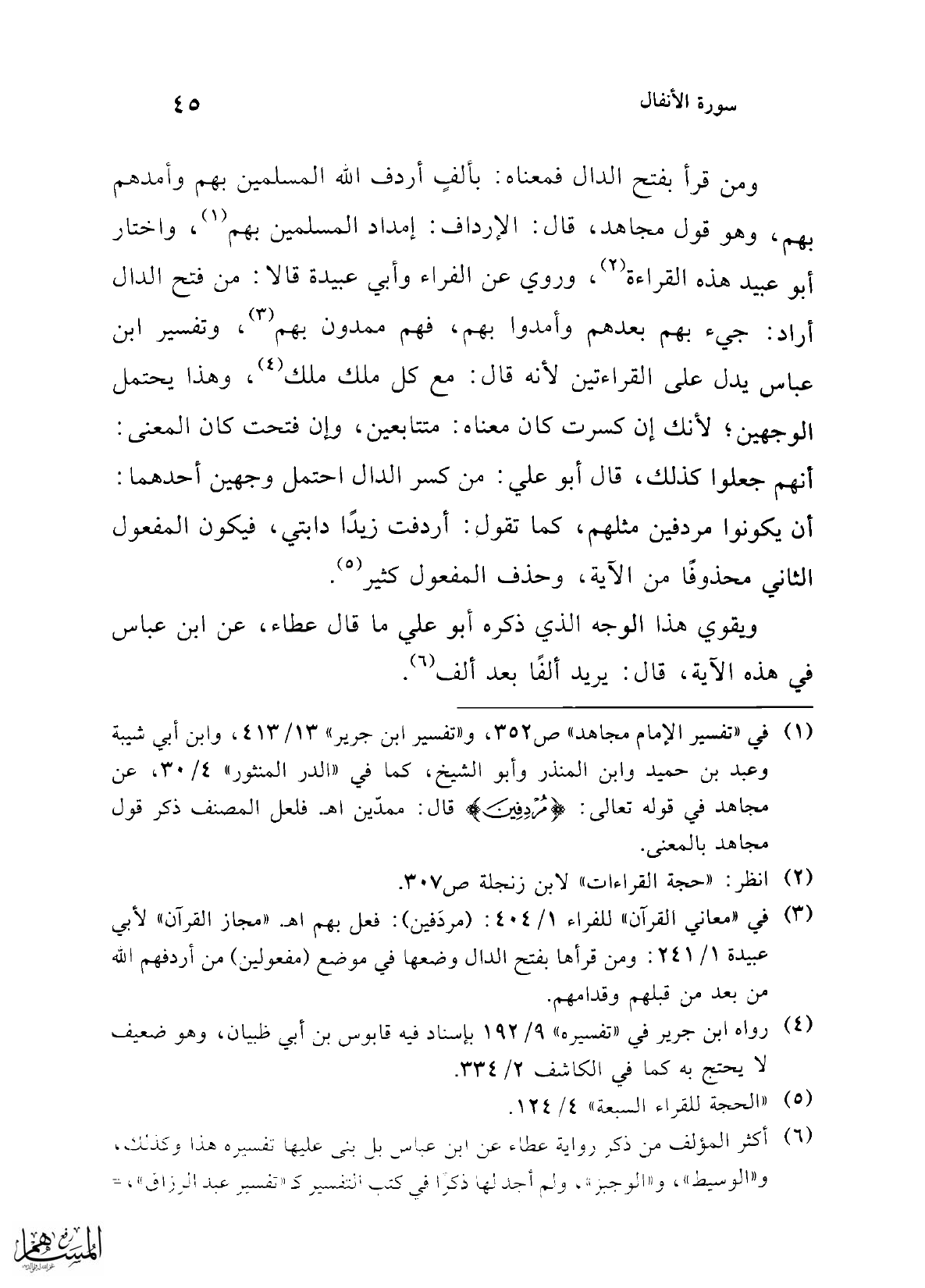 (¬3) في "معاني القرآن" للفراء 1/ 404: (مردَفين): فعل بهم اهـ. "مجاز القرآن" لأبي عبيدة 1/ 241: ومن قرأها بفتح الدال وضعها في موضع (مفعولين) من أردفهم الله من بعد من قبلهم وقدامهم.