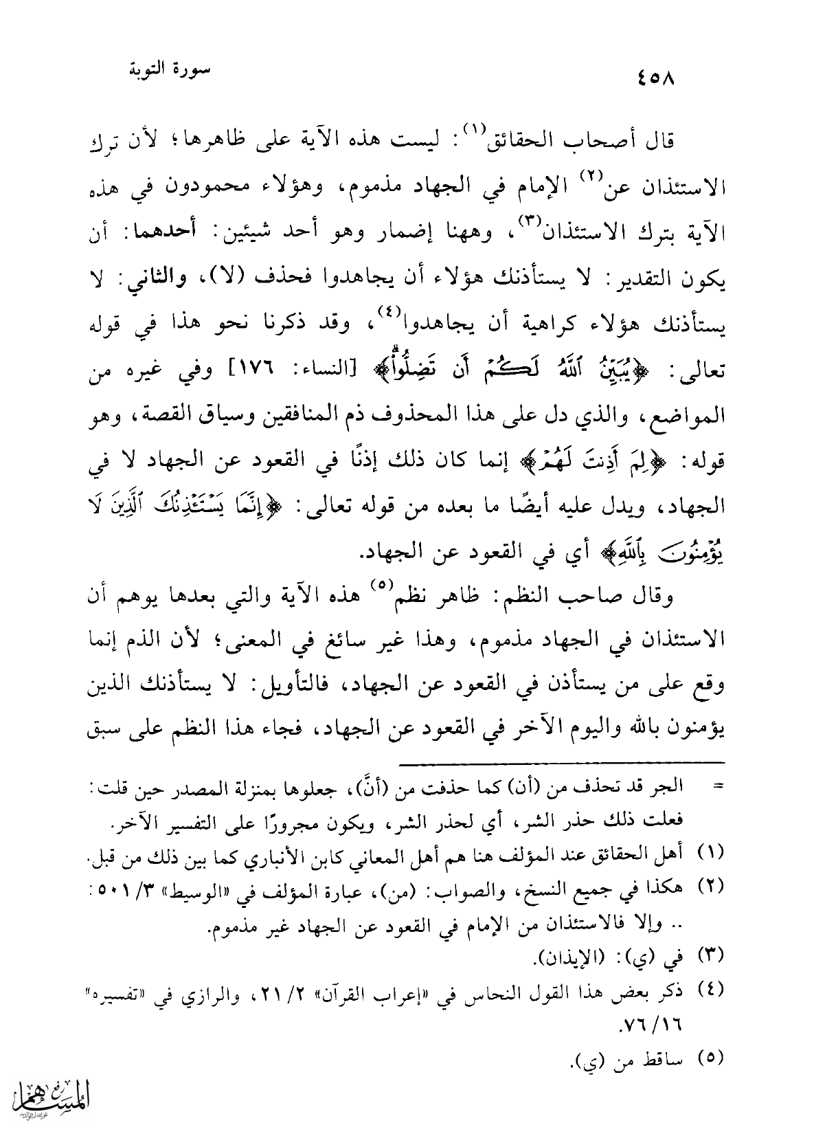 قال أصحاب الحقائق (¬1): ليست هذه الآية على ظاهرها؛ لأن ترك الاستئذان عن (¬2) الإمام في الجهاد مذموم، وهؤلاء محمودون في هذه الآية بترك الاستئذان (¬3)، وهاهنا إضمار وهو أحد شيئين: أحدهما: أن يكون التقدير: لا يستأذنك هؤلاء أن يجاهدوا فحذف (لا)، والثاني: لا يستأذنك هؤلاء كراهية أن يجاهدوا (¬4)، وقد ذكرنا نحو هذا في قوله تعالى: {يُبَيِّنُ اللَّهُ لَكُمْ أَنْ تَضِلُّوا} [النساء: 176] وفي غيره من المواضع، والذي دل على هذا المحذوف ذم المنافقين وسياق القصة، وهو قوله: {لِمَ أَذِنْتَ لَهُمْ} إنما كان ذلك إذنًا في القعود عن الجهاد لا في الجهاد، ويدل عليه أيضًا ما بعده من قوله تعالى: {إِنَّمَا يَسْتَأْذِنُكَ الَّذِينَ لَا يُؤْمِنُونَ بِاللَّهِ} أي في القعود عن الجهاد.
