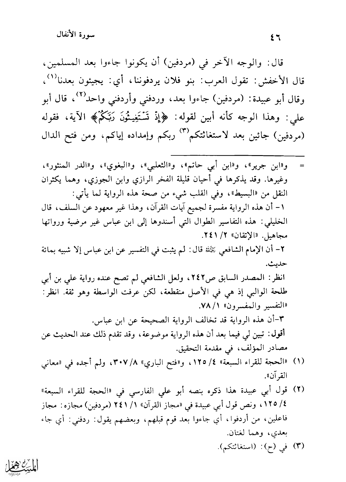 (¬2) قول أبي عبيدة هذا ذكره بنصه أبو علي الفارسي في "الحجة للقراء السبعة" 4/ 125، ونص قول أبي عبيدة في "مجاز القرآن" 1/ 241 (مردفين) مجازه: مجاز فاعلين، من أردفوا، أي جاءوا بعد قوم قبلهم، وبعضهم يقول: ردفني. أي جاء بعدي، وهما لغتان.