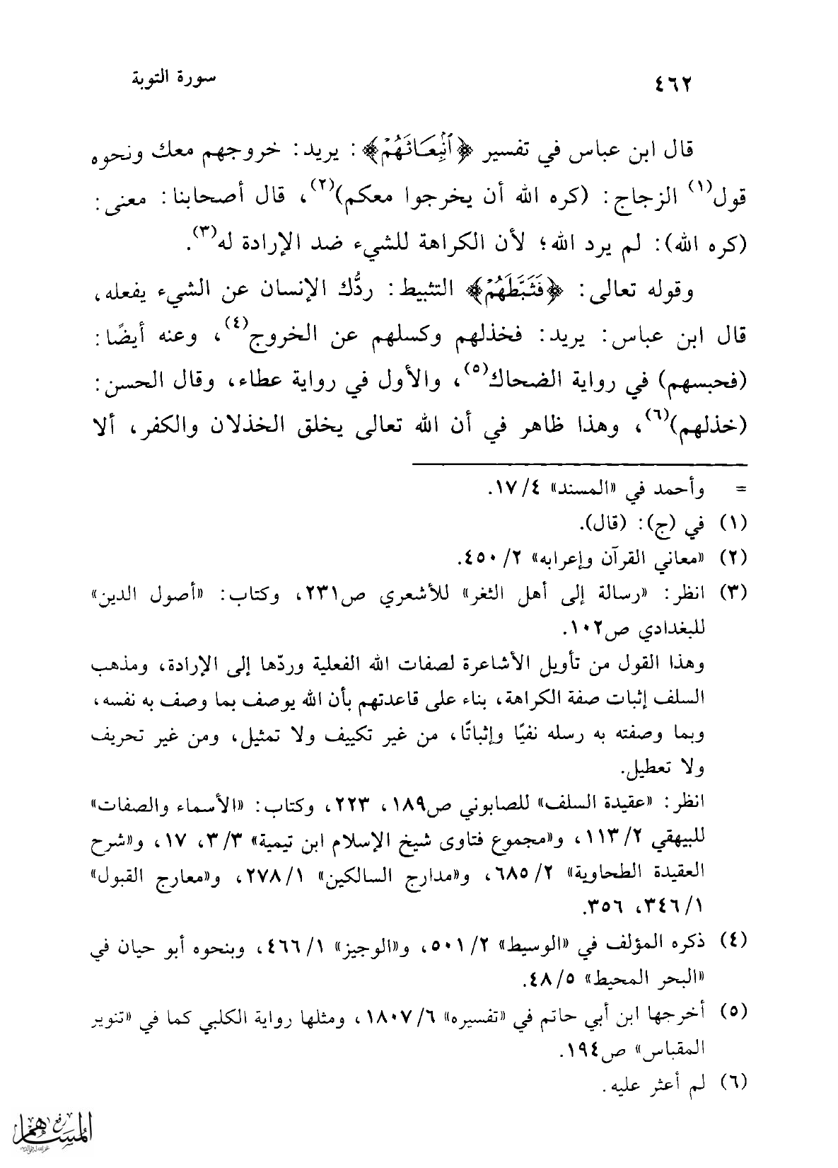 قال ابن عباس في تفسير {انْبِعَاثَهُمْ}: يريد: خروجهم معك ونحوه قول (¬1) الزجاج: (كره الله أن يخرجوا معكم) (¬2)، قال أصحابنا: معنى: (كره الله): لم يرد الله؛ لأن الكراهة للشيء ضد الإرادة له (¬3).