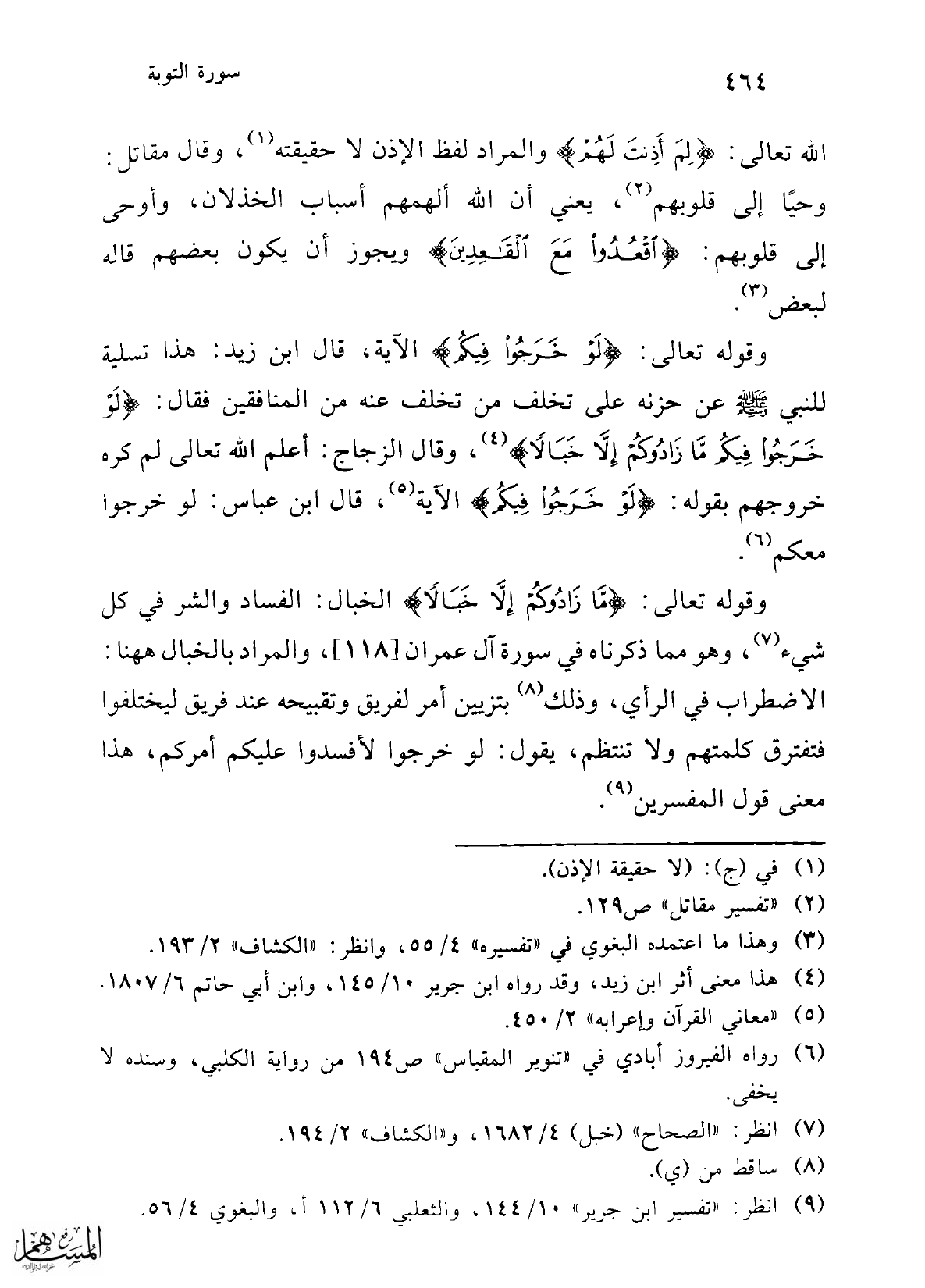 وقوله تعالى: {لَوْ خَرَجُوا فِيكُمْ} الآية، قال ابن زيد: هذا تسلية للنبي - صلى الله عليه وسلم - عن حزنه على تخلف من تخلف عنه من المنافقين فقال: {لَوْ خَرَجُوا فِيكُمْ مَا زَادُوكُمْ إِلَّا خَبَالًا} (¬4)، وقال الزجاج: أعلم الله تعالى لم كره خروجهم بقوله: {لَوْ خَرَجُوا فِيكُمْ} الآية (¬5)، قال ابن عباس: لو خرجوا معكم (¬6).