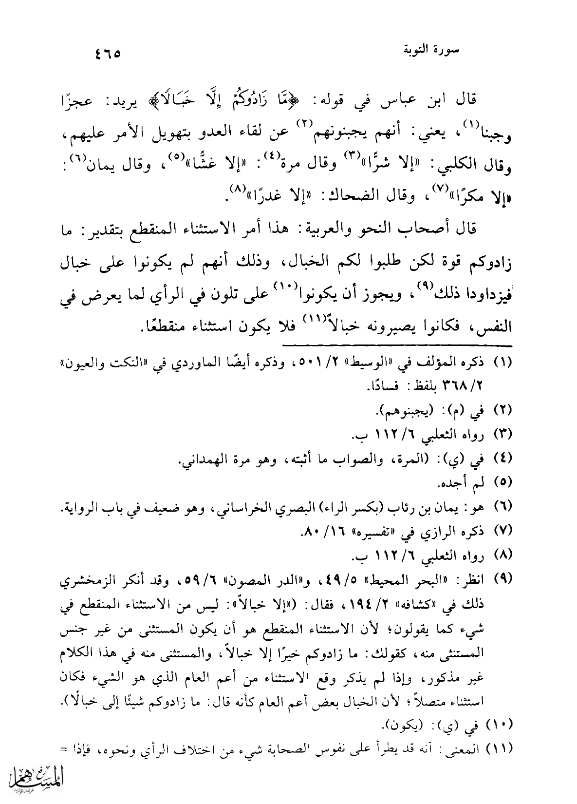 (¬9) انظر: "البحر المحيط" 5/ 49، و"الدر المصون" 6/ 59، وقد أنكر الزمخشري ذلك في "كشافه" 2/ 194، فقال: ("إلا خبالاً": ليس من الاستثناء المنقطع في شيء كما يقولون؛ لأن الاستثناء المنقطع هو أن يكون المستثنى من غير جنس المستنثى منه، كقولك: ما زادوكم خيرًا إلا خبالاً، والمستثنى منه في هذا الكلام غير مذكور، وإذا لم يذكر وقع الاستثناء من أعم العام الذي هو الشيء فكان استثناء متصلاً؛ لأن الخبال بعض أعم العام كأنه قال: ما زادوكم شيئًا إلى خبالاً).