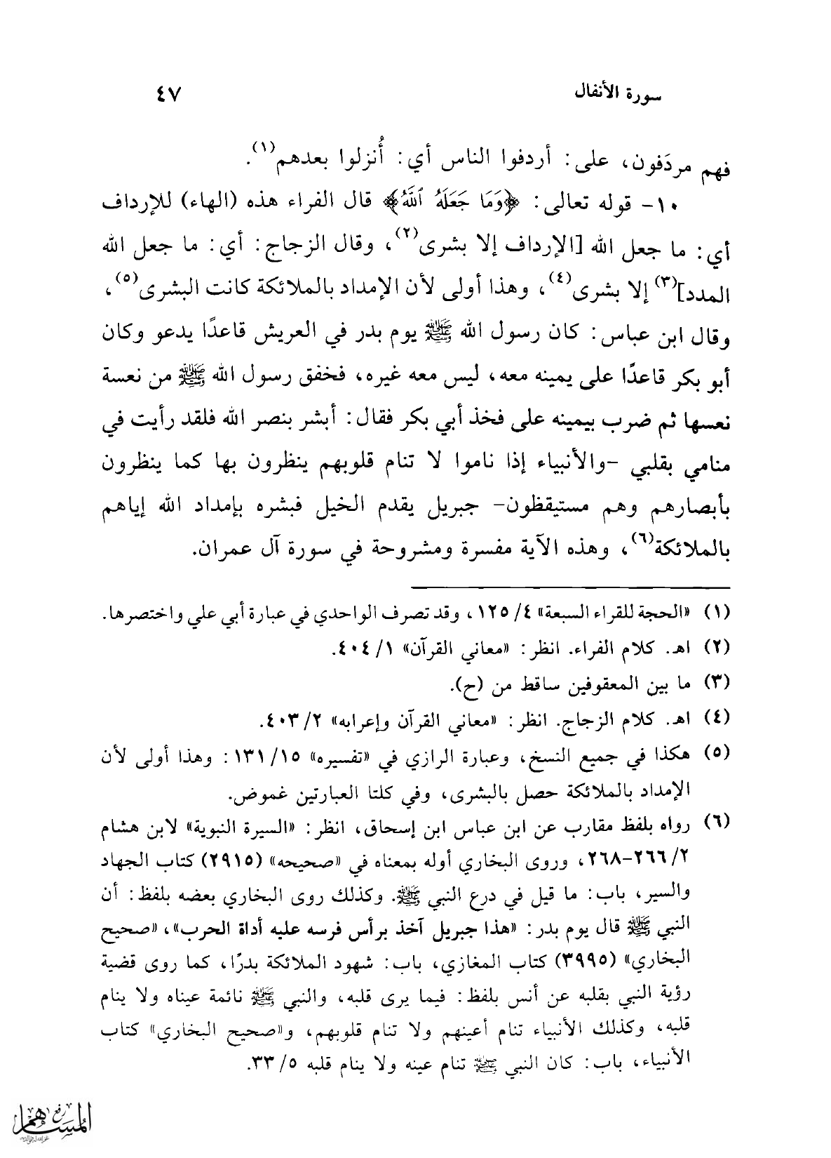 (¬5) هكذا في جميع النسخ، وعبارة الرازي في "تفسيره" 15/ 131: وهذا أولى لأن الإمداد بالملائكة حصل بالبشرى، وفي كلتا العبارتين غموض.