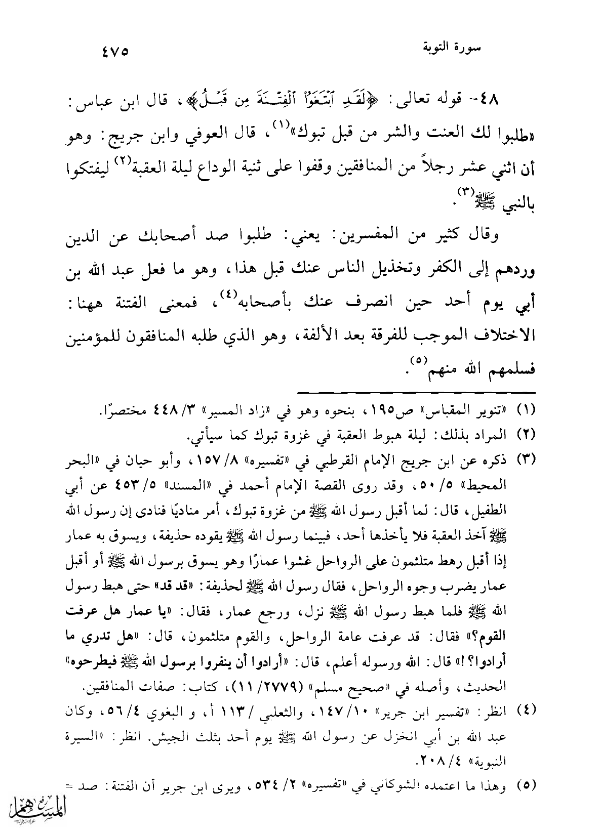 (¬3) ذكره عن ابن جريج الإمام القرطبي في "تفسيره" 8/ 157، وأبو حيان في "البحر المحيط" 5/ 50، وقد روى القصة الإمام أحمد في "المسند" 5/ 453 عن أبي الطفيل، قال: لما أقبل رسول الله -صلى الله عليه وسلم- من غزوة تبوك، أمر مناديًا فنادى إن رسول الله - صلى الله عليه وسلم - آخذ العقبة فلا يأخذها أحد، فبينما رسول الله -صلى الله عليه وسلم- يقوده حذيفة، ويسوق به عمار إذا أقبل وهي متلثمون على الرواحل غشوا عمارًا وهو يسوق برسول الله - صلى الله عليه وسلم - أو أقبل عمار يضرب وجوه الرواحل، فقال رسول الله -صلى الله عليه وسلم- لحذيفة: "قد قد" حتى هبط رسول الله - صلى الله عليه وسلم - فلما هبط رسول الله -صلى الله عليه وسلم- نزل، ورجع عمار، فقال: "يا عمار هل عرفت القوم؟ " فقال: قد عرفت عامة الرواحل، والقوم متلثمون، قال: "هل تدري ما أرادوا؟! " قال: الله ورسوله أعلم، قال: "أرادو اأن ينفروا برسول الله - صلى الله عليه وسلم - فيطرحوه" الحديث، وأصله في "صحيح مسلم" (2779/ 11)، كتاب: صفات المنافقين.