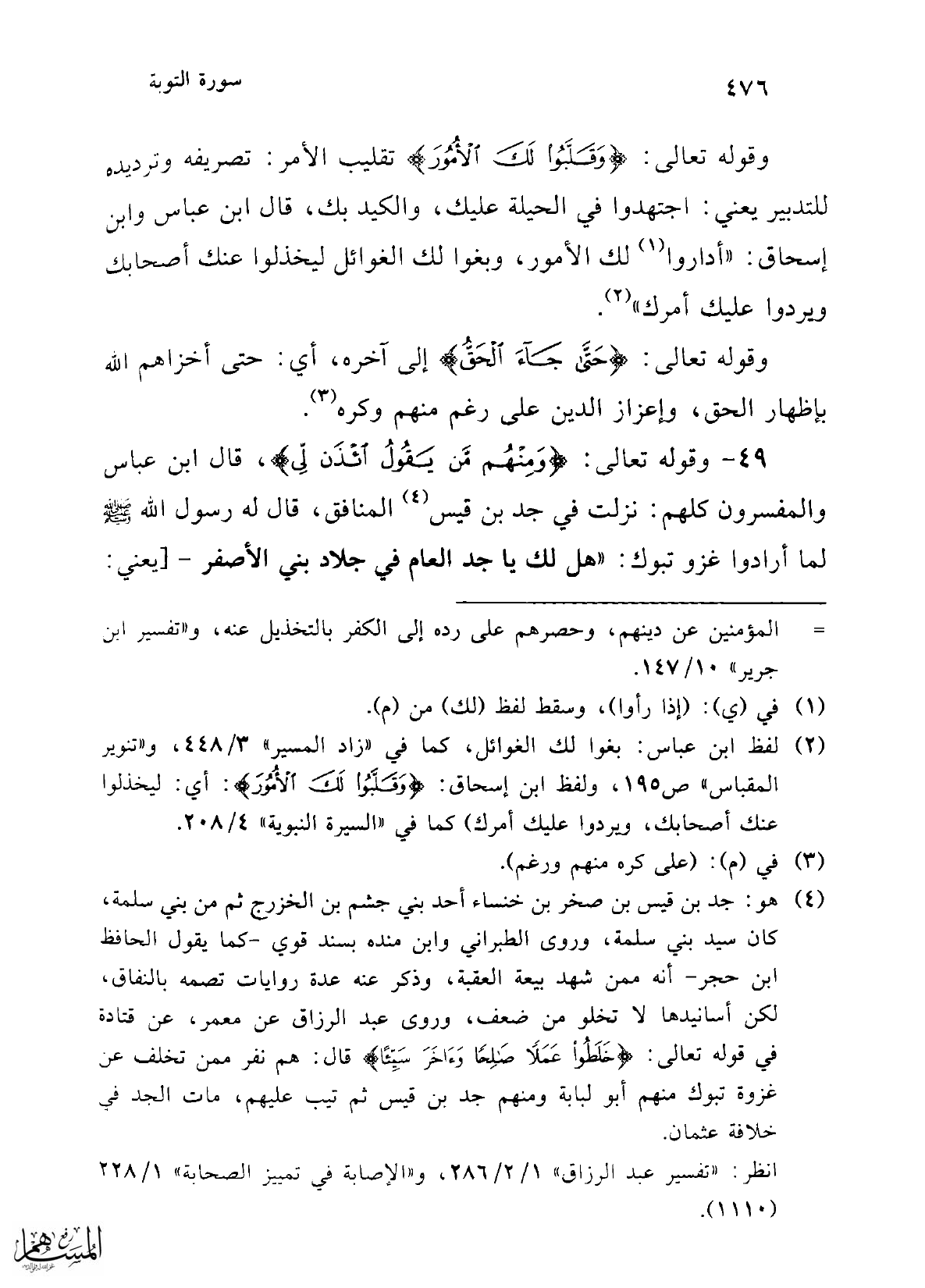 (¬2) لفظ ابن عباس: بغوا لك الغوائل، كما في "زاد المسير" 3/ 448، و"تنوير المقباس" ص 195، ولفظ ابن إسحاق: {وَقَلَّبُوا لَكَ الْأُمُورَ}: أي: ليخذلوا عنك أصحابك، ويردوا عليك أمرك) كما في "السيرة النبوية" 4/ 208.