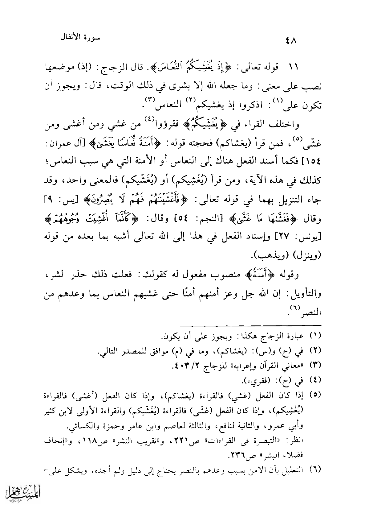 (¬5) إذا كان الفعل (غشي) فالقراءة (يغشاكم)، وإذا كان الفعل (أغشى) فالقراءة (يُغْشِيكم)، وإذا كان الفعل (غشى) فالقراءة (يُغَشّيكم) والقراءة الأولى لابن كثير وأبي عمرو، والثانية لنافع، والثالثة لعاصم وابن عامر وحمزة والكسائي.