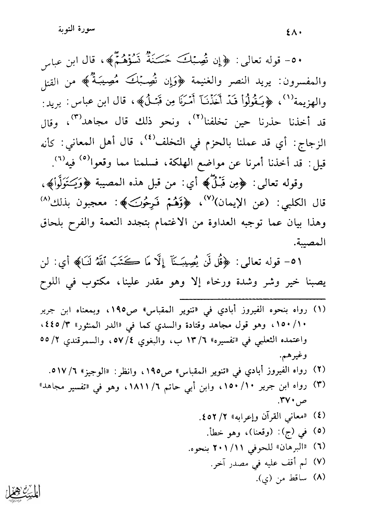 51 - قوله تعالى: {قُلْ لَنْ يُصِيبَنَا إِلَّا مَا كَتَبَ اللَّهُ لَنَا} أي: لن يصبنا خير وشر وشدة ورخاء إلا وهو مقدر علينا، مكتوب في اللوح