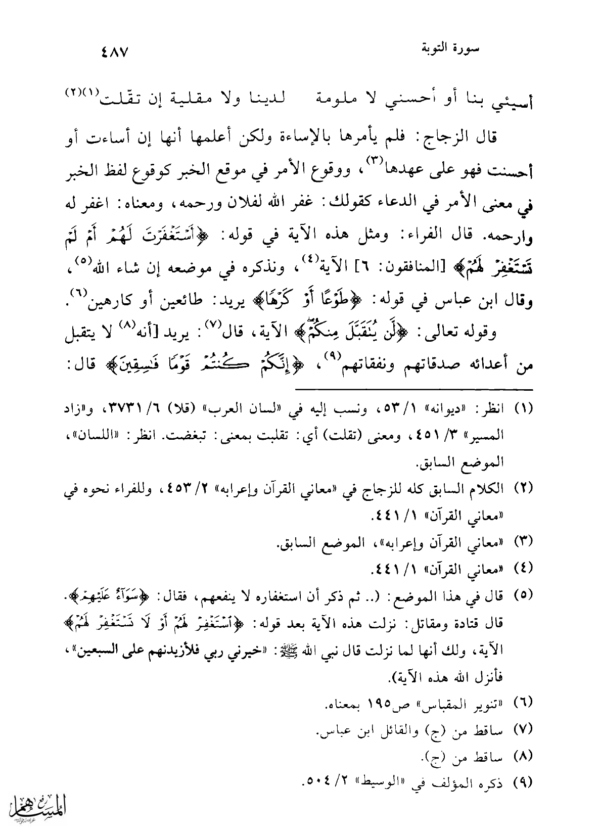 (¬5) قال في هذا الموضع: (.. ثم ذكر أن استغفاره لا ينفعهم، فقال: {سَوَاءٌ عَلَيْهِمْ}. قال قتادة ومقاتل: نزلت هذه الآية بعد قوله: {أَسْتَغْفَرَ لَهُمْ أَمْ لَمْ تَسْتَغْفِرْ لَهُمْ} الآية، ولك أنها لما نزلت قال نبي الله - صلى الله عليه وسلم -: "خيرني ربي فلأزيدنهم على السبعين"، فأنزل الله هذه الآية).
