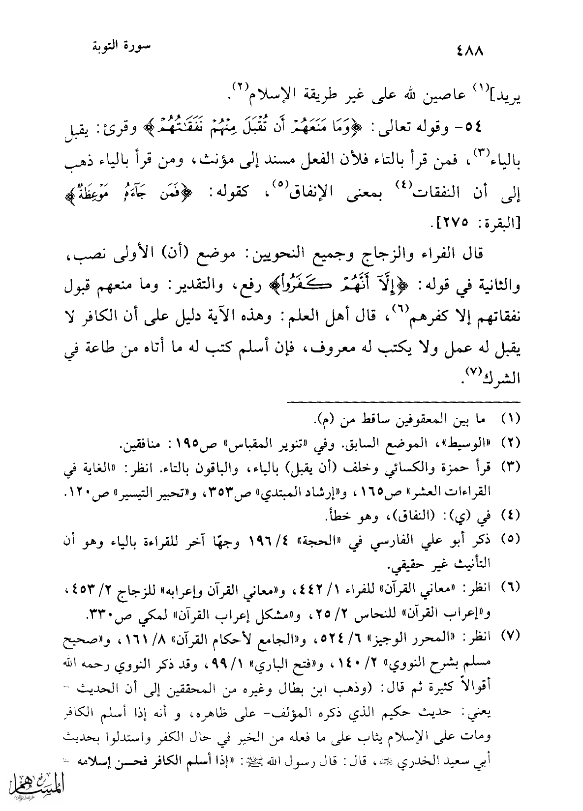 قال الفراء والزجاج وجميع النحويين: موضع (أن) الأولى نصب، والثانية في قوله: {إِلَّا الَّذِينَ كَفَرُوا} رفع، والتقدير: وما منعهم قبول نفقاتهم إلا كفرهم (¬6)، قال أهل العلم: وهذه الآية دليل على أن الكافر لا يقبل له عمل ولا يكتب له معروف، فإن أسلم كتب له ما أتاه من طاعة في الشرك (¬7).