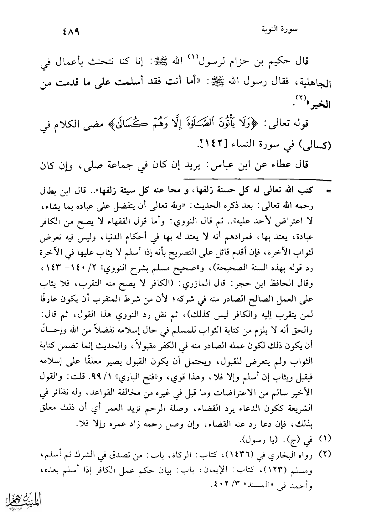 = كتب الله تعالى له كل حسنة زلفها، ومحا عنه كل سيئة زلفها" .. قال ابن بطال رحمه الله تعالى: بعد ذكره الحديث: "ولله تعالى أن يتفضل على عباده بما يشاء، لا اعتراض لأحد عليه" .. ثم قال النووي: وأما قول الفقهاء لا يصح من الكافر عبادة، يعتد بها، فمرادهم أنه لا يعتد له بها في أحكام الدنيا، وليس فيه تعرض لثواب الآخرة، فإن أقدم قائل على التصريح بأنه إذا أسلم لا يثاب عليها في الآخرة رد قوله بهذه السنة الصحيحة)، و"صحيح مسلم بشرح النووي" 2/ 140 - 143، وقال الحافظ ابن حجر: قال المازري: (الكافر لا يصح منه التقرب، فلا يثاب على العمل الصالح الصادر منه في شركه؛ لأن من شرط المتقرب أن يكون عارفاً لمن يتقرب إليه والكافر ليس كذلك)، ثم نقل رد النووي هذا القول، ثم قال: والحق أنه لا يلزم من كتابة الثواب للمسلم في حال إسلامه تفضلاً من الله وإحسانًا أن يكون ذلك لكون عمله الصادر منه في الكفر مقبولاً، والحديث إنما تضمن كتابة الثواب ولم يتعرض للقبول، ويحتمل أن يكون القبول يصير معلقًا على إسلامه فيقبل ويثاب إن أسلم وإلا فلا، وهذا قوي، و"فتح الباري" 1/ 99. قلت: والقول الأخير سالم من الاعتراضات وما قيل في غيره من مخالفة القواعد، وله نظائر في الشريعة ككون الدعاء يرد القضاء، وصلة الرحم تزيد العمر أي أن ذلك معلق بذلك، فإن دعا رد عنه القضاء، وإن وصل رحمه زاد عمره وإلا فلا.