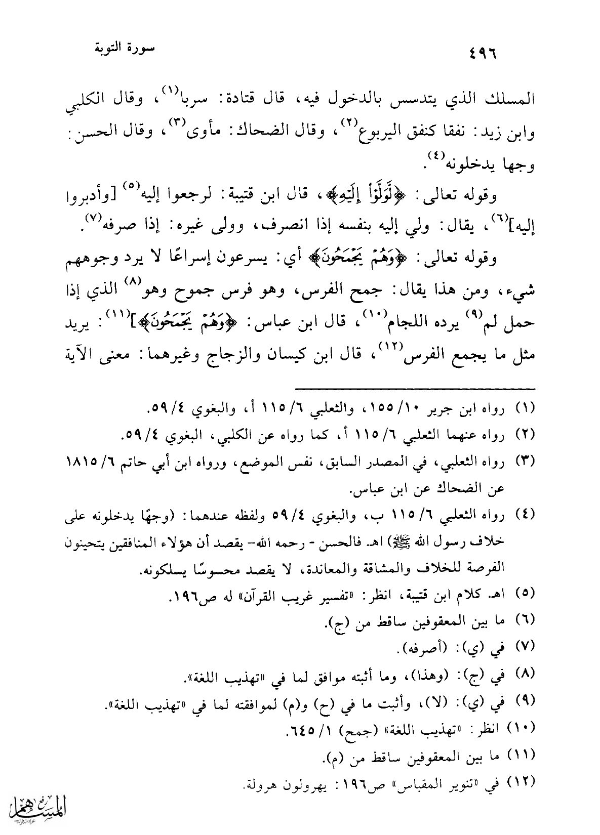 (¬4) رواه الثعلبي 6/ 115 ب، والبغوي 4/ 59 ولفظه عندهما: (وجهًا يدخلونه على خلاف رسول الله -صلى الله عليه وسلم) اهـ. فالحسن -رحمه الله- يقصد أن هؤلاء المنافقين يتحينون الفرصة للخلاف والمشاقة والمعاندة، لا يقصد محسوسًا يسلكونه.