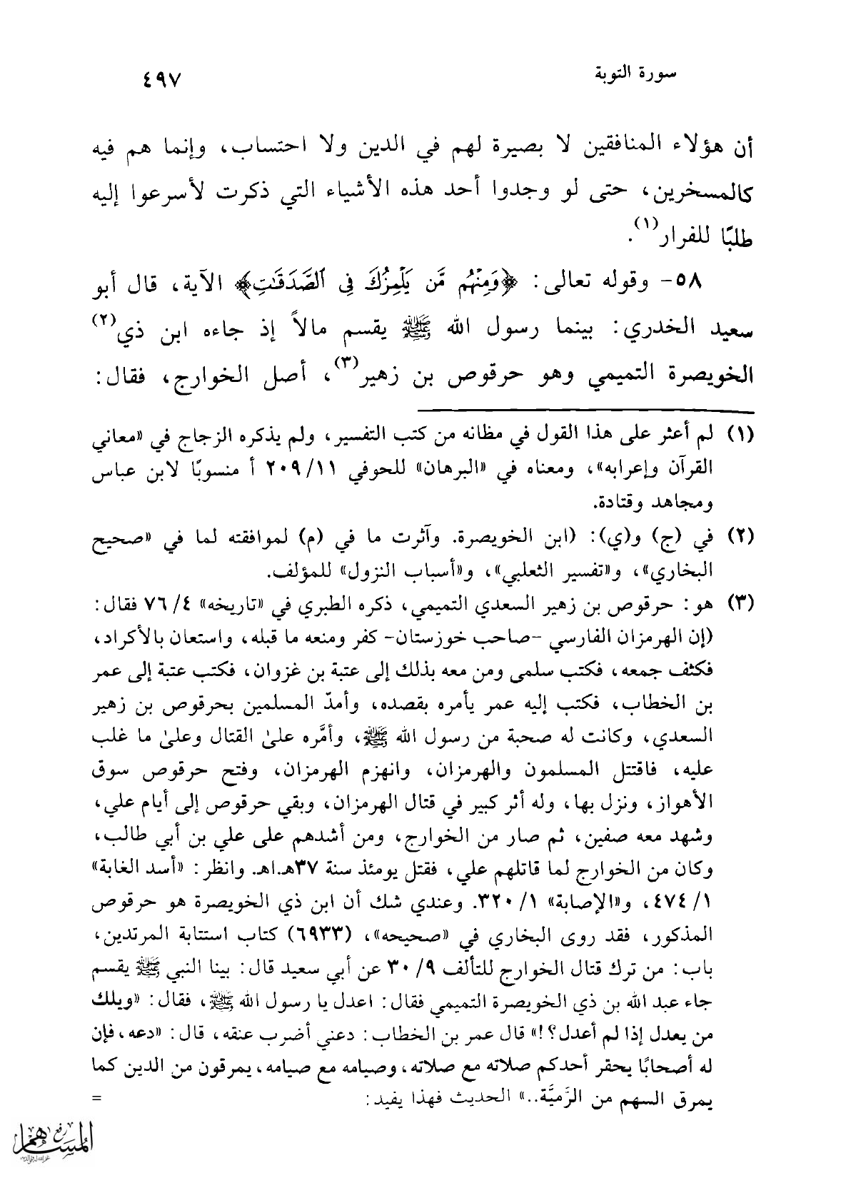 58 - وقوله تعالى: {وَمِنْهُمْ مَنْ يَلْمِزُكَ فِي الصَّدَقَاتِ} الآية، قال أبو سعيد الخدري: بينما رسول الله -صلى الله عليه وسلم- يقسم مالاً إذ جاءه ابن ذي (¬2) الخويصرة التميمي وهو حرقوص بن زهير (¬3)، أصل الخوارج، فقال: