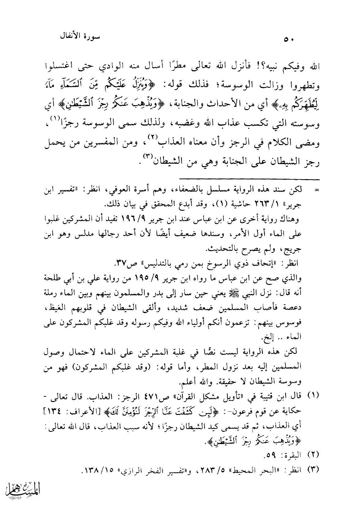 الله وفيكم نبيه؟! فأنزل الله تعالى مطرًا أسال منه الوادي حتى اغتسلوا وتطهروا وزالت الوسوسة؛ فذلك قوله: {وَيُنَزِّلُ عَلَيْكُمْ مِنَ السَّمَاءِ مَاءً لِيُطَهِّرَكُمْ بِهِ} أي من الأحداث والجنابة، {وَيُذْهِبَ عَنْكُمْ رِجْزَ الشَّيْطَانِ} أي وسوسته التي تكسب عذاب الله وغضبه، ولذلك سمى الوسوسة رجزًا (¬1)، ومضى الكلام في الرجز وأن معناه العذاب (¬2)، ومن المفسرين من يحمل رجز الشيطان على الجنابة وهي من الشيطان (¬3).