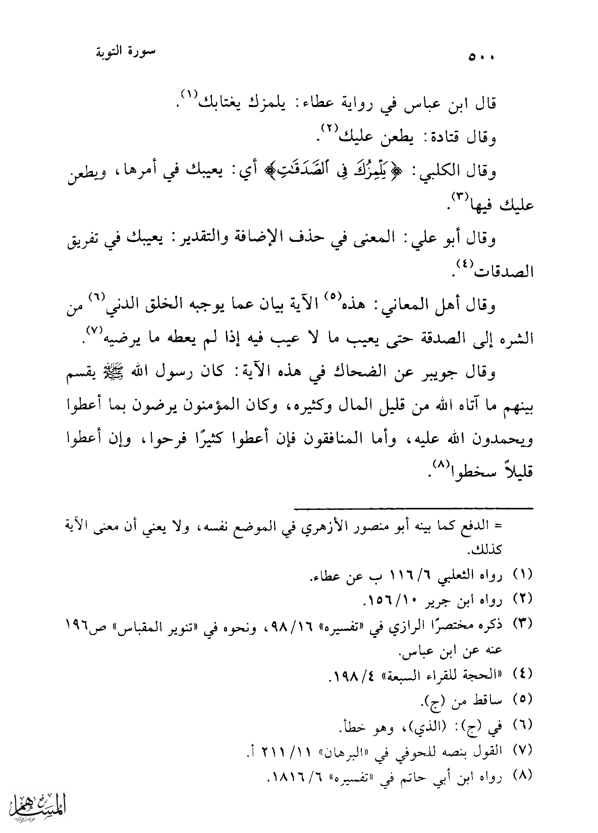 وقال الكلبي: {يَلْمِزُكَ فِي الصَّدَقَاتِ} أي: يعيبك في أمرها، ويطعن عليك فيها (¬3).